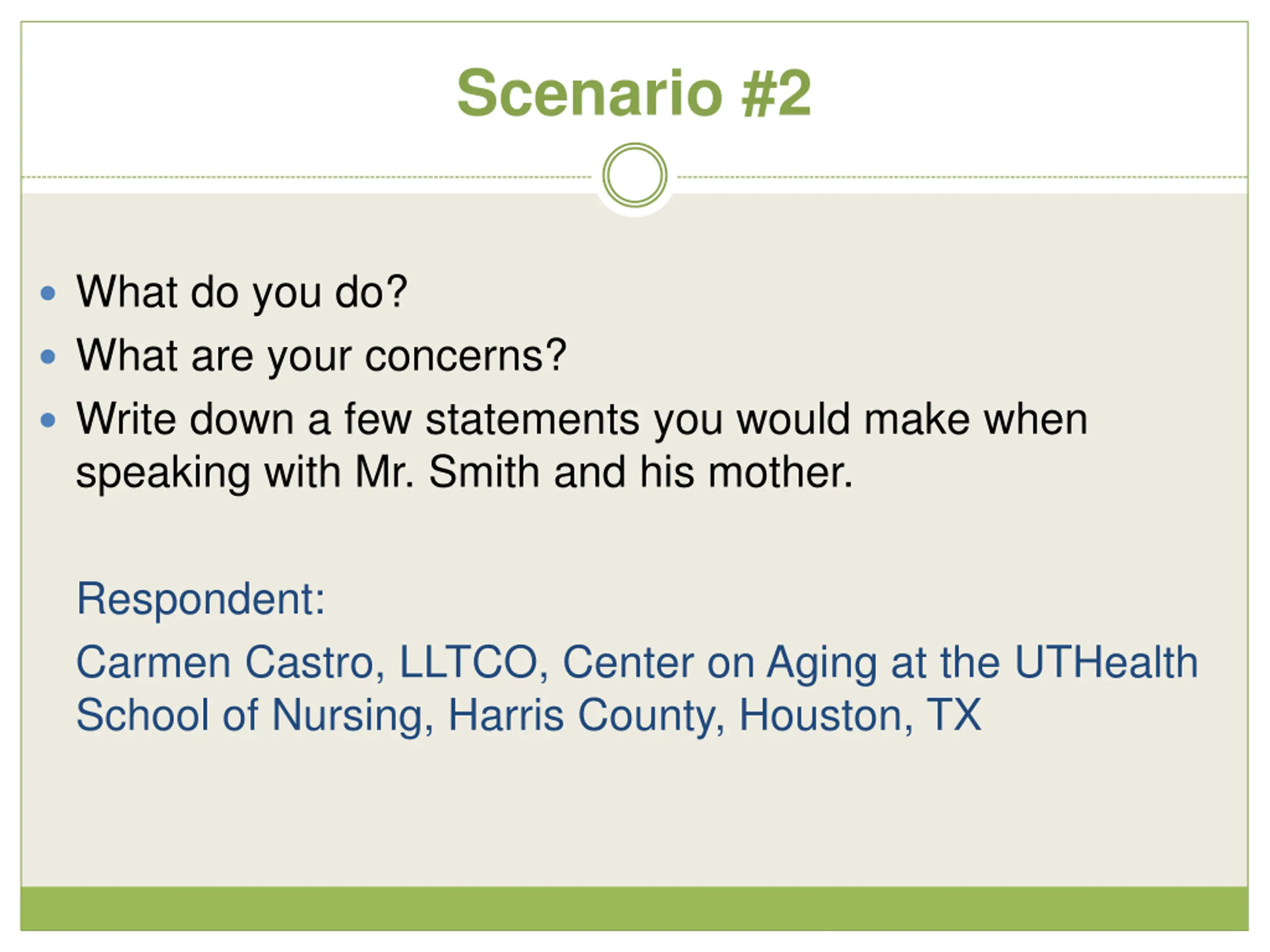 Scenario #2 What do you do? What are your concerns? Write down a few statements you would make when speaking with Mr. Smith and his mother. Respondent: Carmen Castro, LLTCO, Center on Aging at the UTHealth School of Nursing, Harris County, Houston, TX