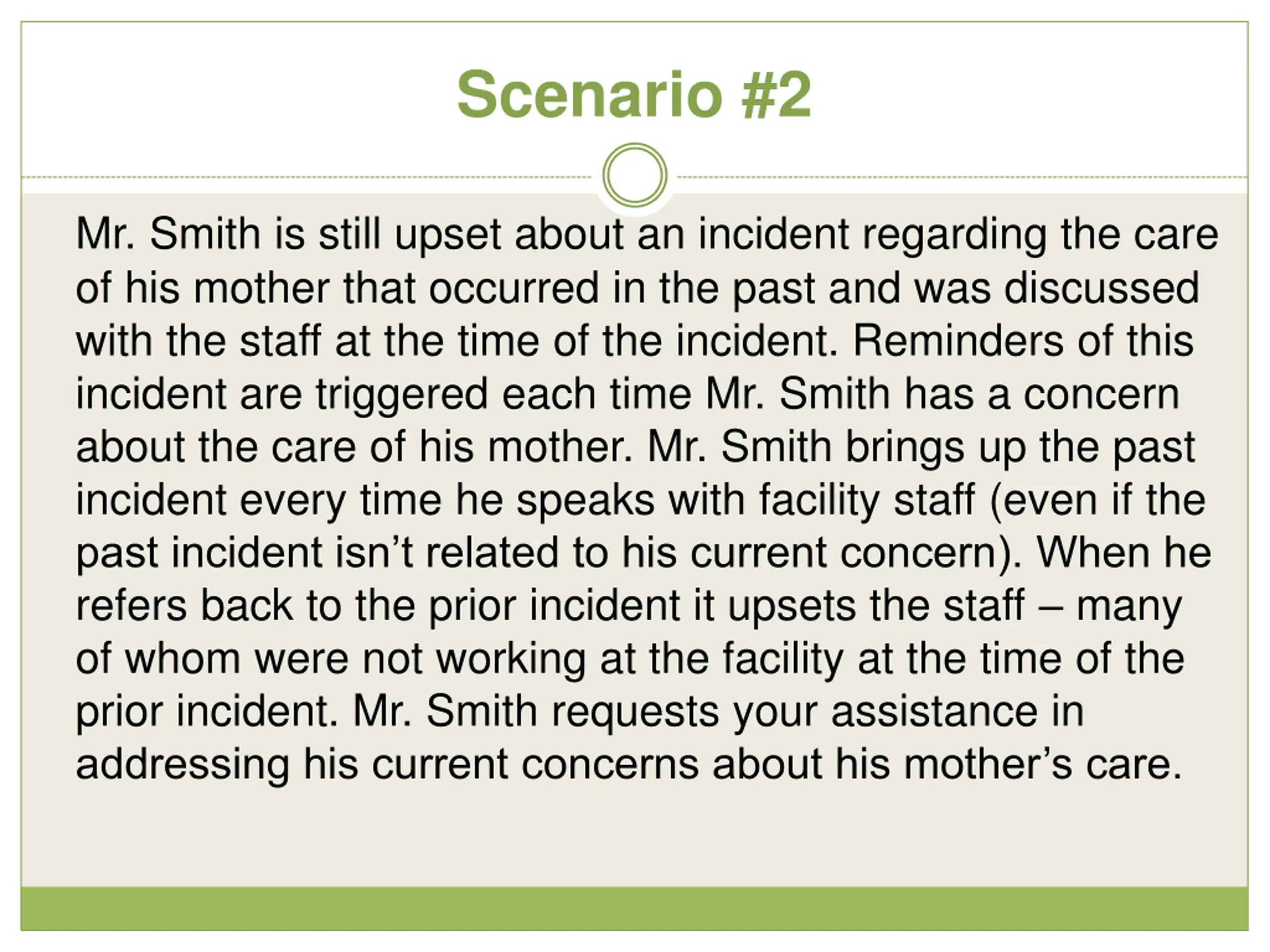 Scenario #2 Mr. Smith is still upset about an incident regarding the care of his mother that occurred in the past and was discussed with the staff at the time of the incident. Reminders of this incident are triggered each time Mr. Smith has a concern about the care of his mother. Mr. Smith brings up the past incident every time he speaks with facility staff (even if the past incident isn t related to his current concern). When he refers back to the prior incident it upsets the staff many of whom were not working at the facility at the time of the prior incident. Mr. Smith requests your assistance in addressing his current concerns about his mother s care.