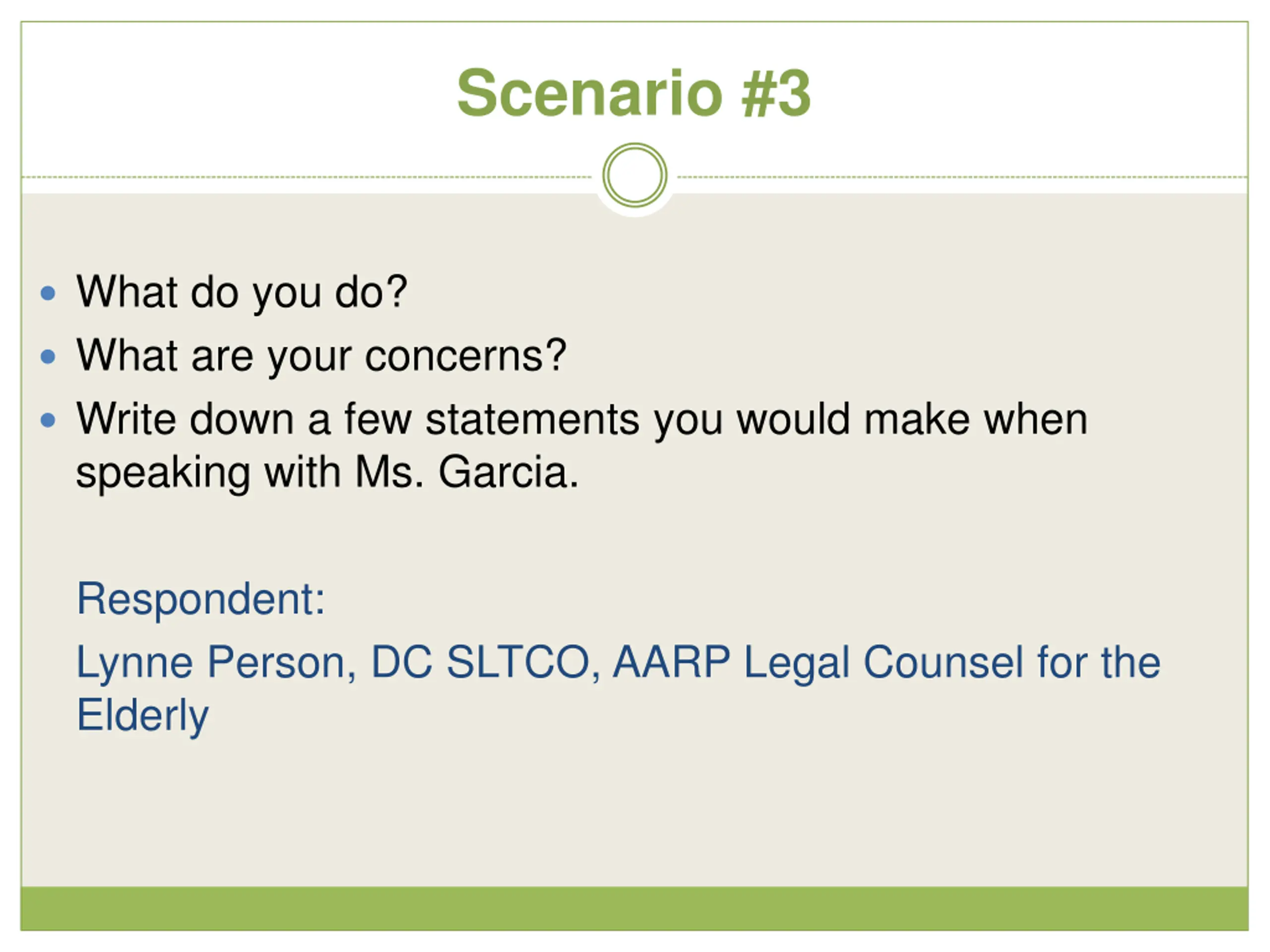 Scenario #3 What do you do? What are your concerns? Write down a few statements you would make when speaking with Ms. Garcia. Respondent: Lynne Person, DC SLTCO, AARP Legal Counsel for the Elderly