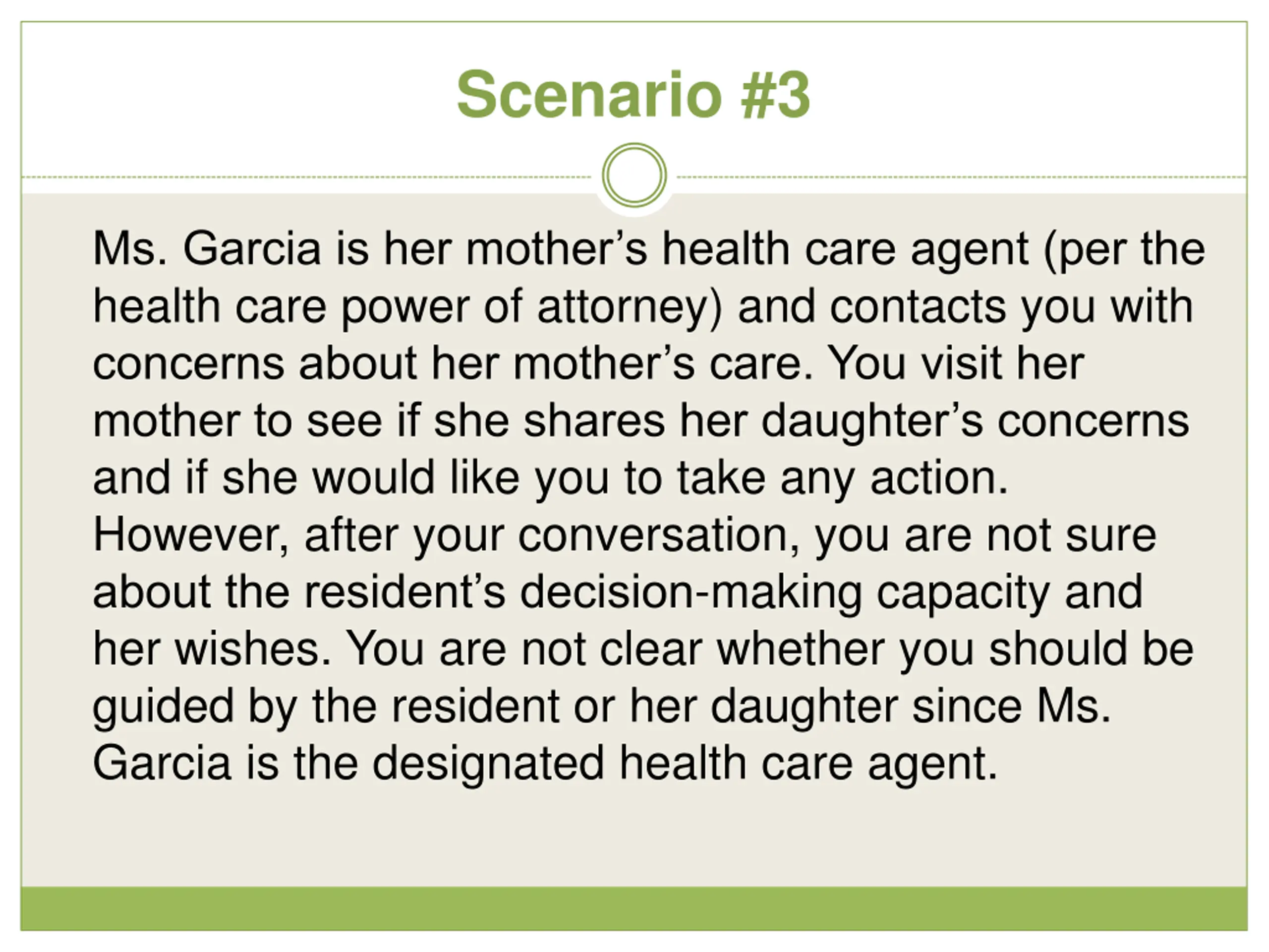 Scenario #3 Ms. Garcia is her mother s health care agent (per the health care power of attorney) and contacts you with concerns about her mother s care. You visit her mother to see if she shares her daughter s concerns and if she would like you to take any action. However, after your conversation, you are not sure about the resident s decision-making capacity and her wishes. You are not clear whether you should be guided by the resident or her daughter since Ms. Garcia is the designated health care agent.