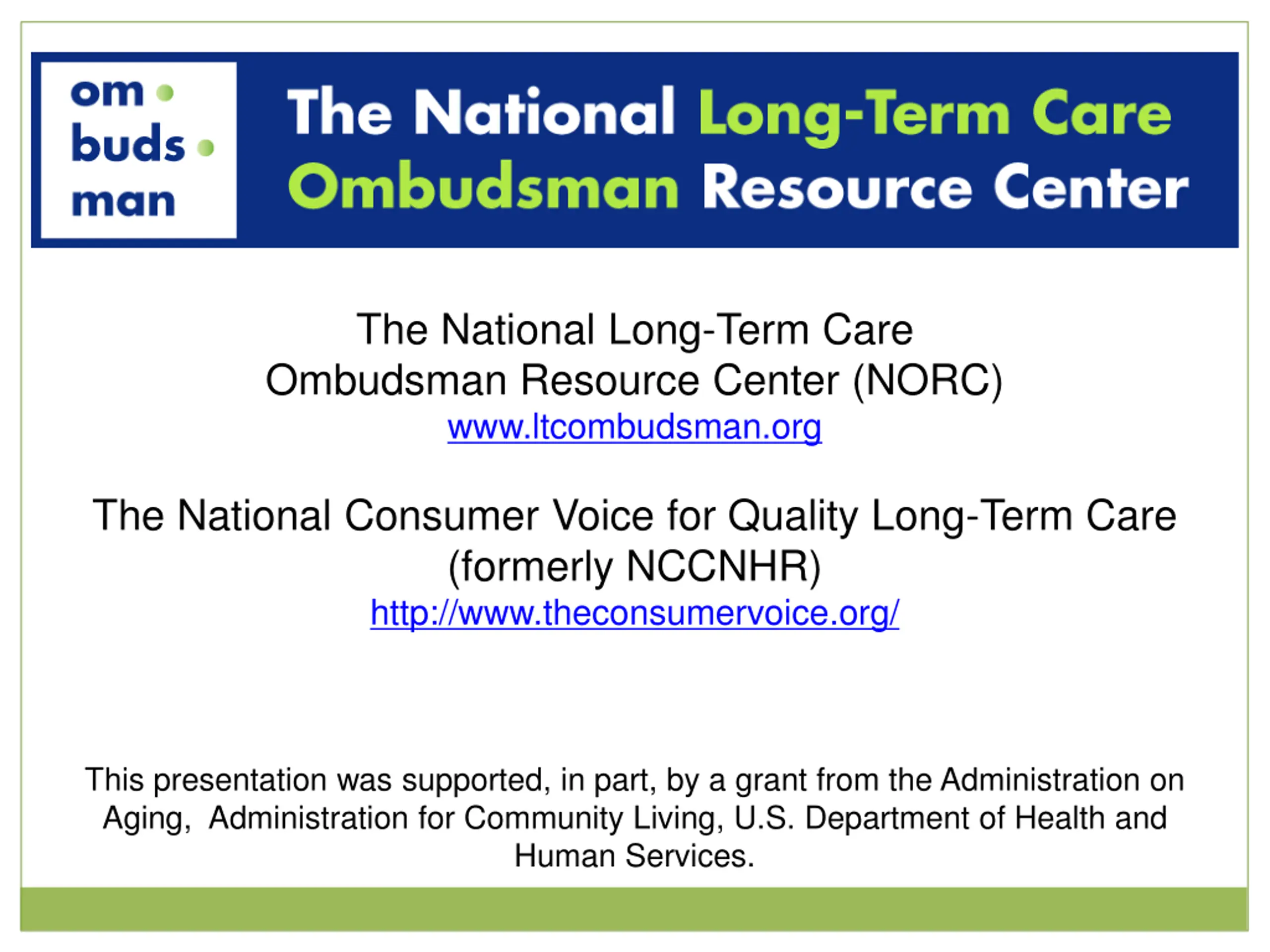 The National Long-Term Care Ombudsman Resource Center (NORC) www.ltcombudsman.org The National Consumer Voice for Quality Long-Term Care (formerly NCCNHR) http://www.theconsumervoice.org/ This presentation was supported, in part, by a grant from the Administration on Aging, Administration for Community Living, U.S. Department of Health and Human Services.