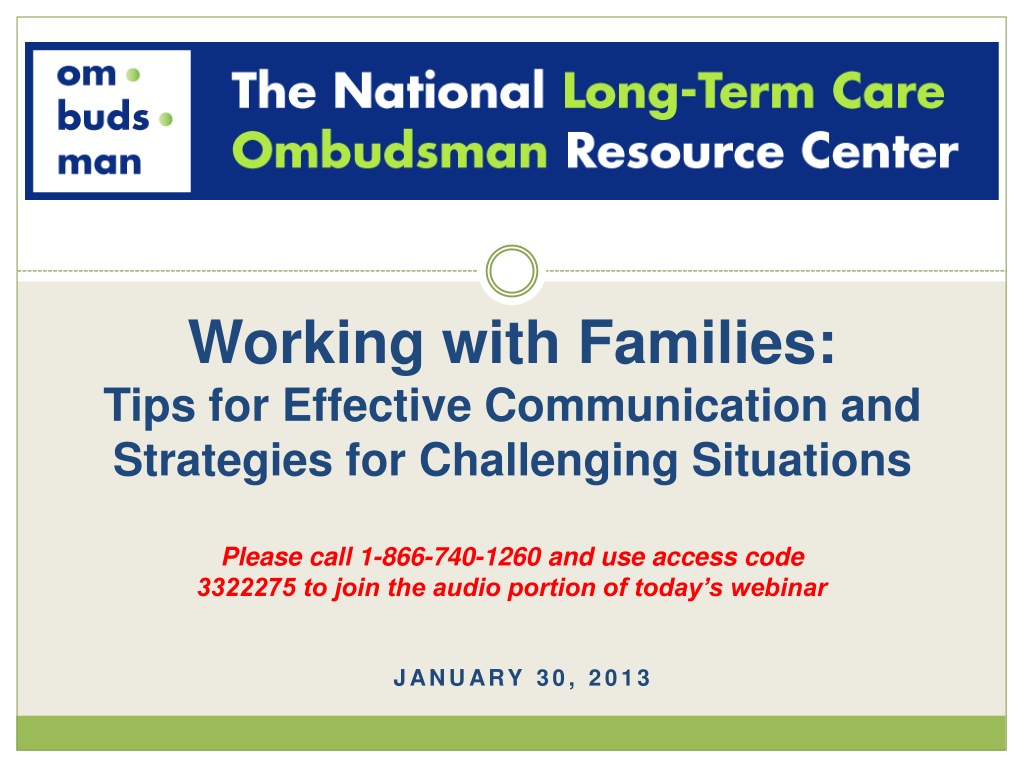 Working with Families: Tips for Effective Communication and Strategies for Challenging Situations Please call 1-866-740-1260 and use access code 3322275 to join the audio portion of today s webinar JANUARY 30, 2013