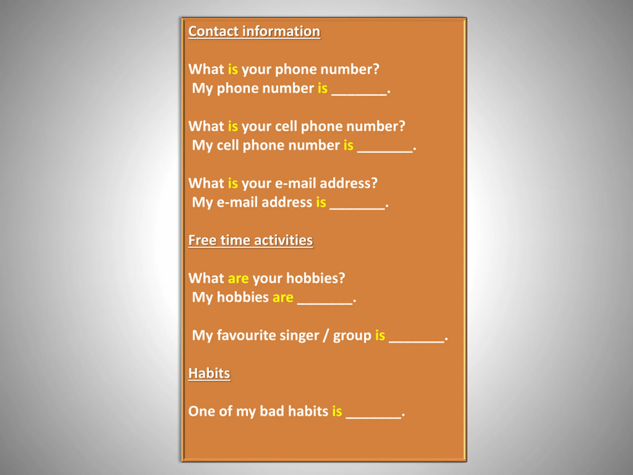 Contact information What is your phone number? My phone number is _______. What is your cell phone number? My cell phone number is _______. What is your e-mail address? My e-mail address is _______. Free time activities What are your hobbies? My hobbies are _______. My favourite singer / group is _______. Habits One of my bad habits is _______.