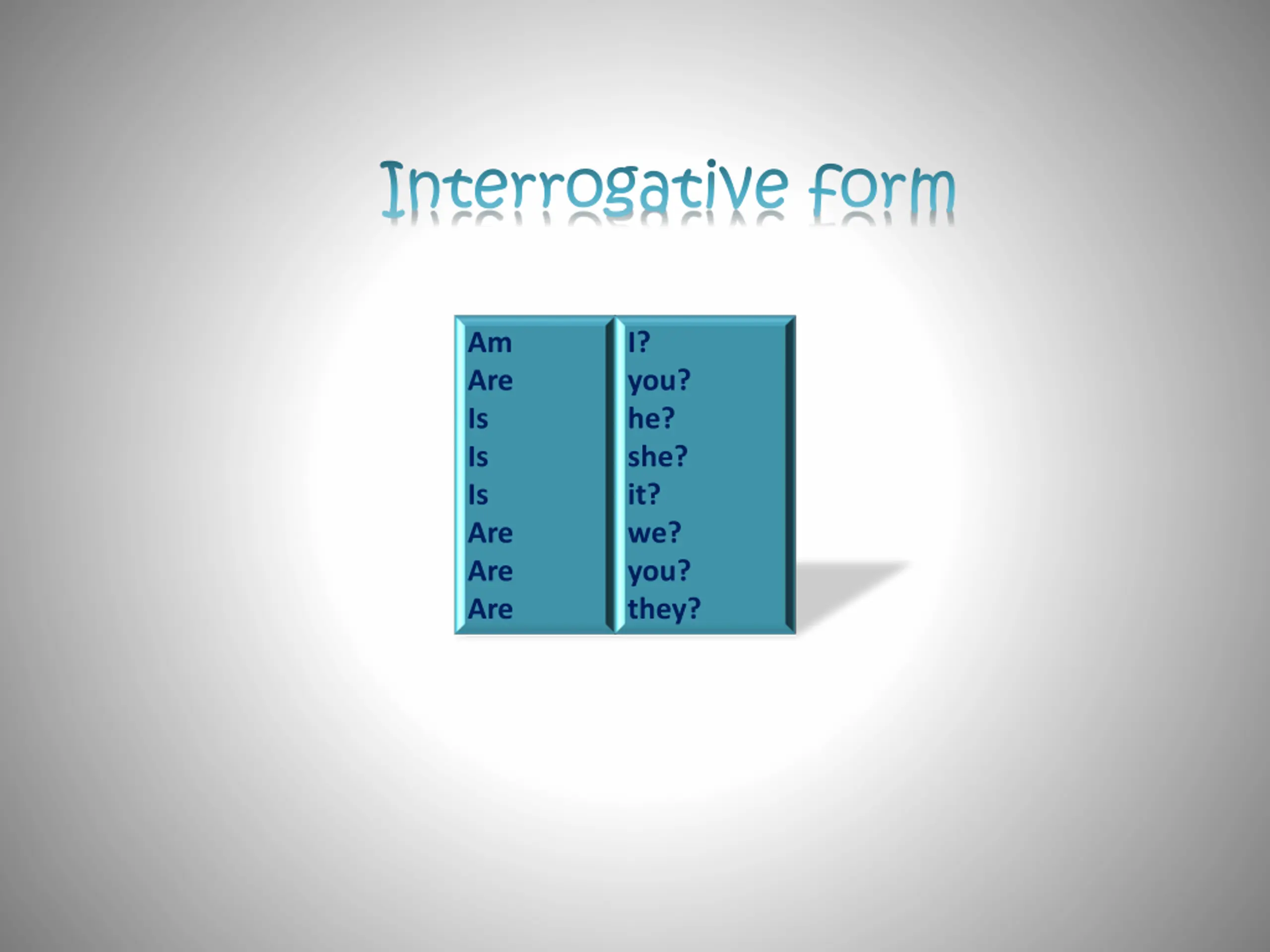 Interrogative form Am Are Is Is Is Are Are Are I? you? he? she? it? we? you? they?
