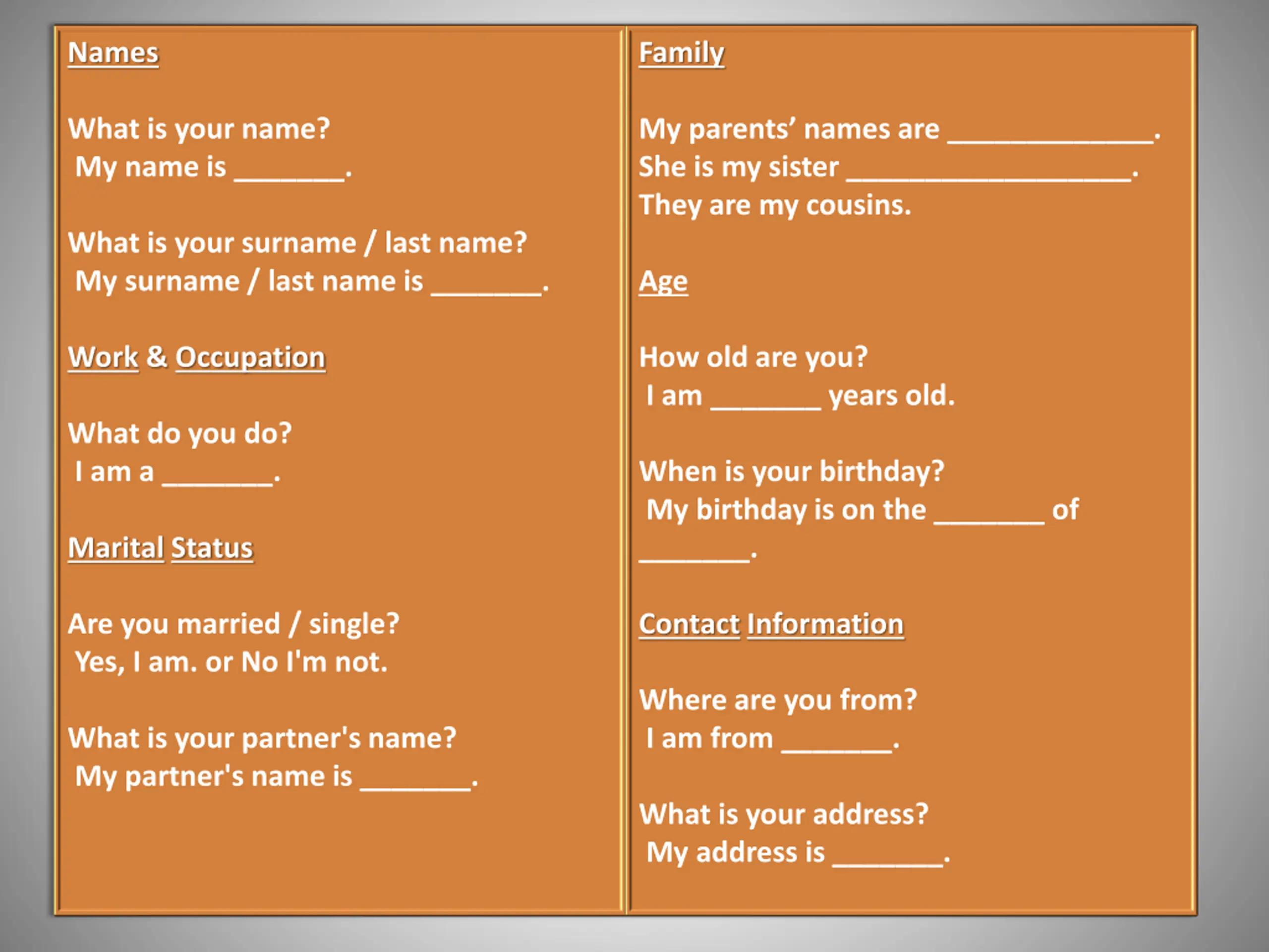 Names Family What is your name? My name is _______. My parents names are _____________. She is my sister __________________. They are my cousins. What is your surname / last name? My surname / last name is _______. Age Work & Occupation How old are you? I am _______ years old. What do you do? I am a _______. When is your birthday? My birthday is on the _______ of _______. Marital Status Are you married / single? Yes, I am. or No I'm not. Contact Information Where are you from? I am from _______. What is your partner's name? My partner's name is _______. What is your address? My address is _______.