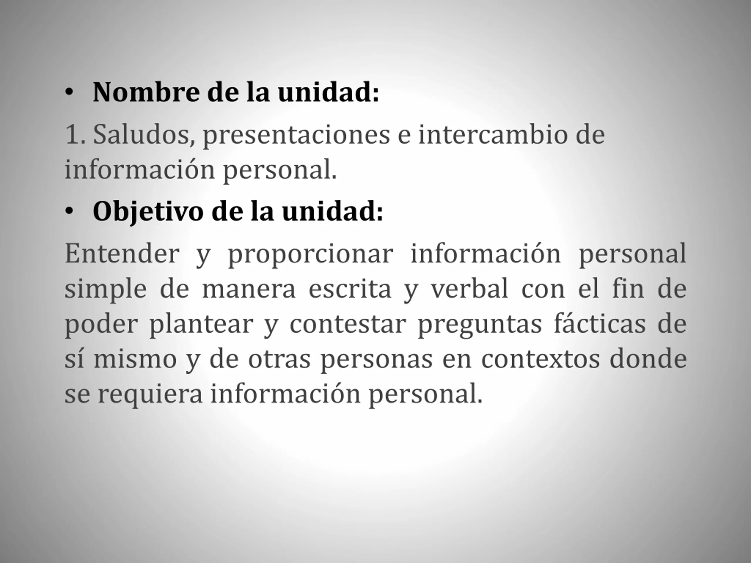 Nombre de la unidad: 1. Saludos, presentaciones e intercambio de informaci n personal. Objetivo de la unidad: Entender y proporcionar informaci n personal simple de manera escrita y verbal con el fin de poder plantear y contestar preguntas f cticas de s mismo y de otras personas en contextos donde se requiera informaci n personal.