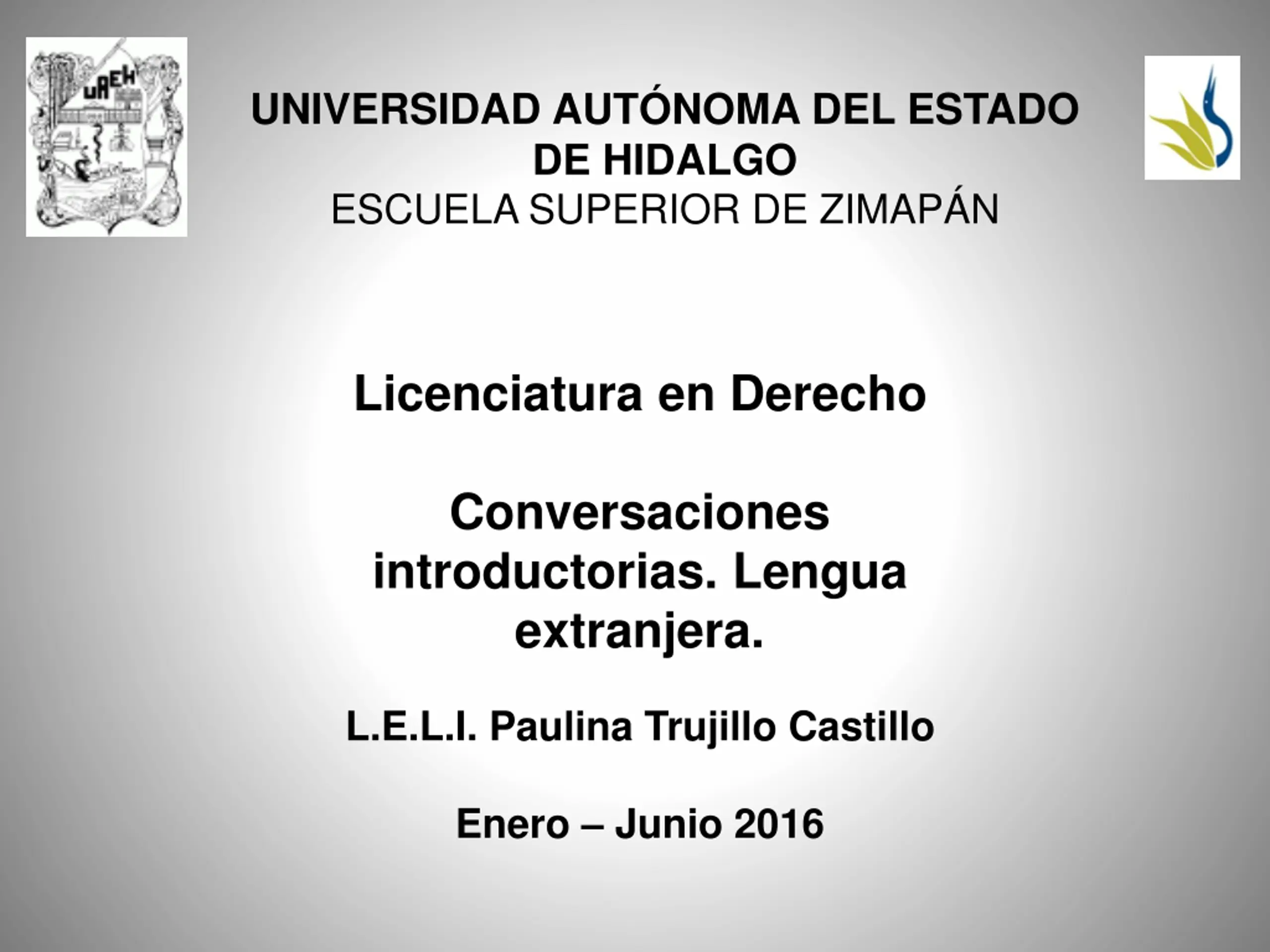 UNIVERSIDAD AUTNOMA DEL ESTADO DE HIDALGO ESCUELA SUPERIOR DE ZIMAP N Licenciatura en Derecho Conversaciones introductorias. Lengua extranjera. L.E.L.I. Paulina Trujillo Castillo Enero Junio 2016