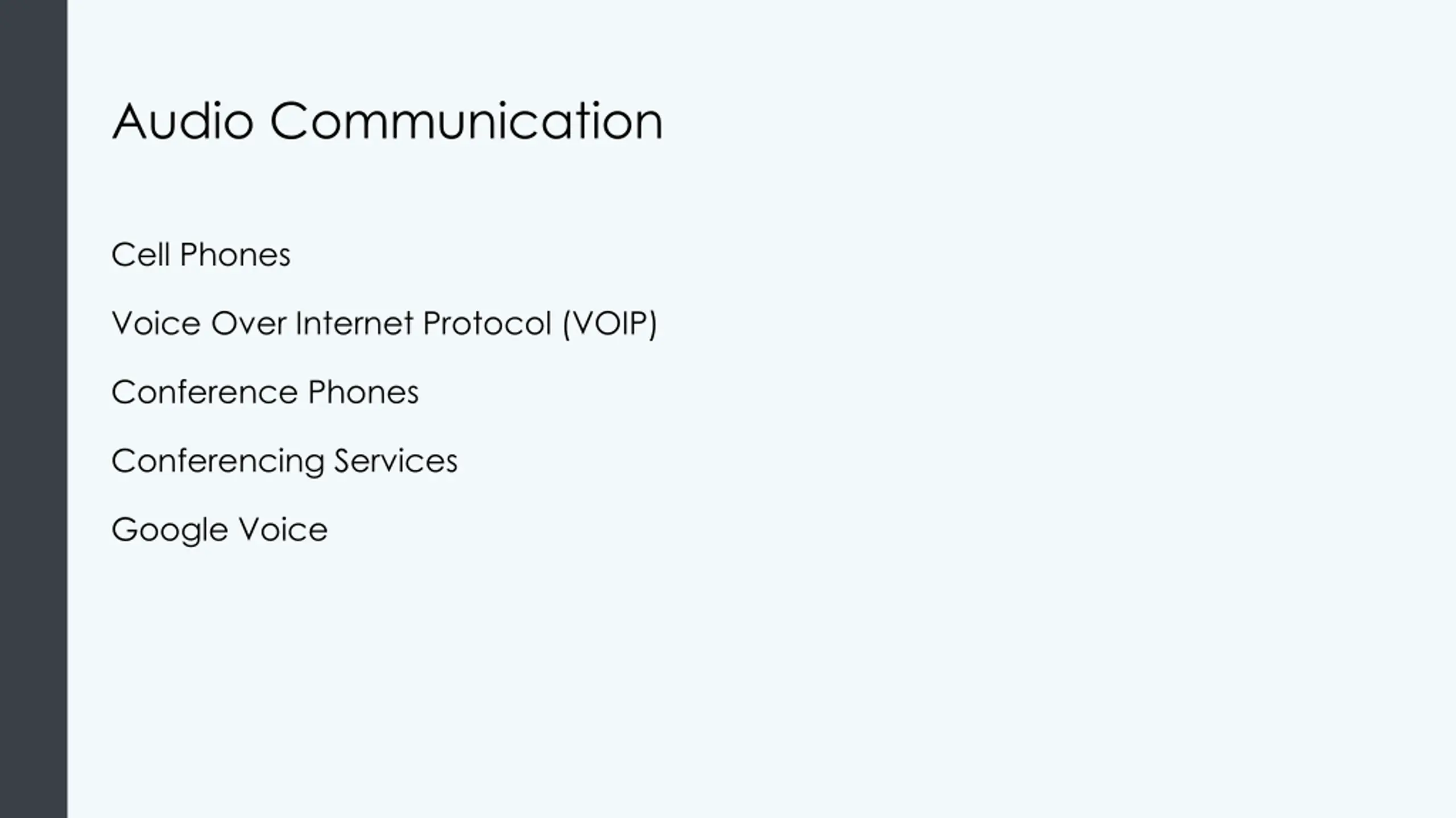 Audio Communication Cell Phones Voice Over Internet Protocol (VOIP) Conference Phones Conferencing Services Google Voice