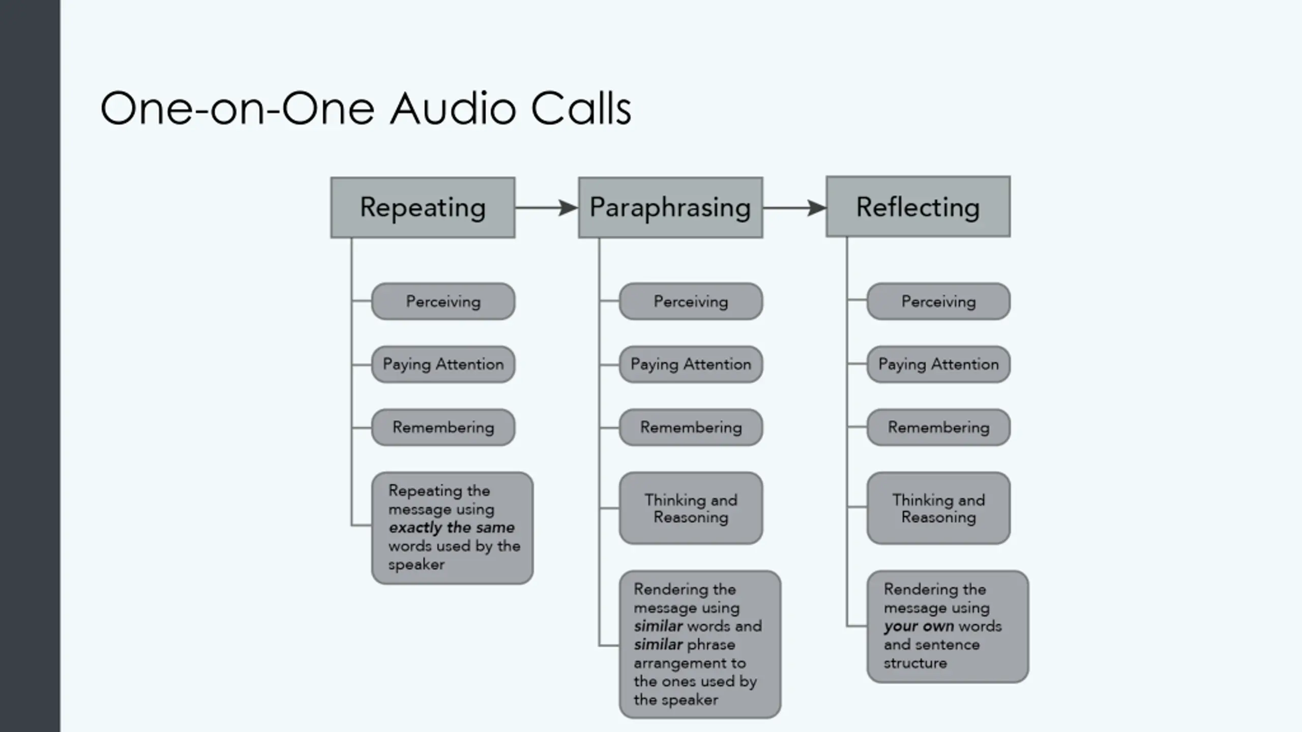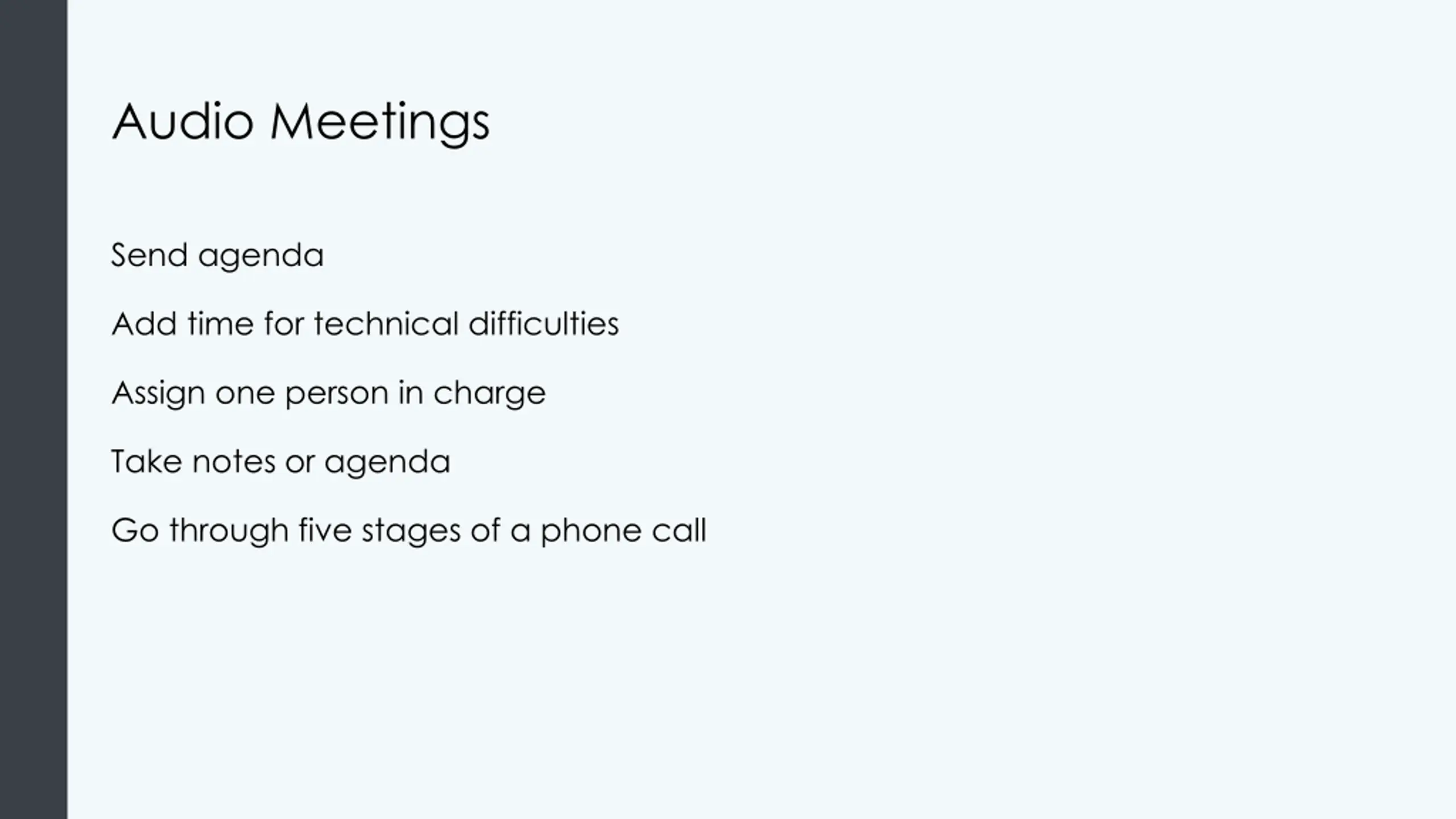 Audio Meetings Send agenda Add time for technical difficulties Assign one person in charge Take notes or agenda Go through five stages of a phone call