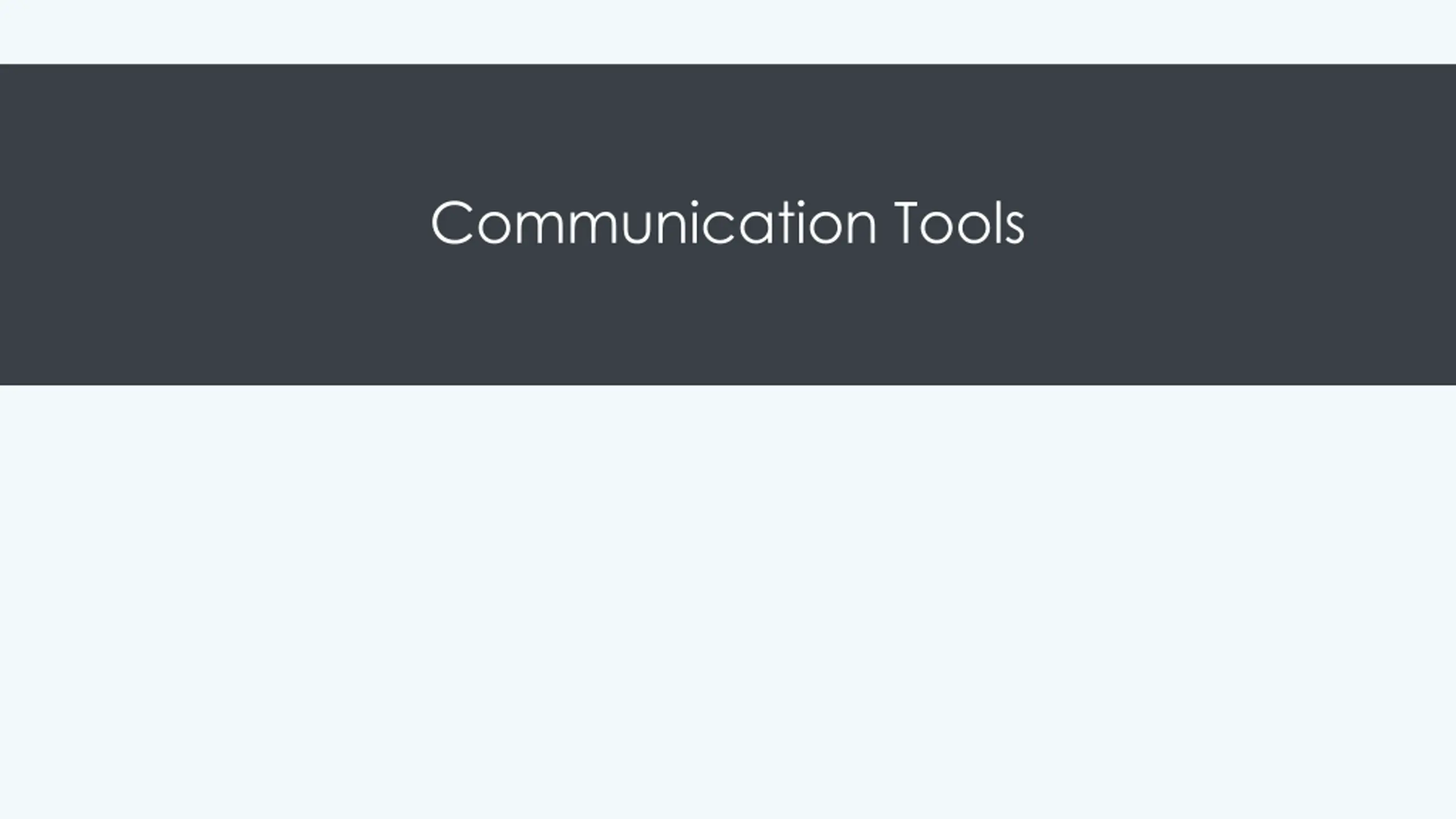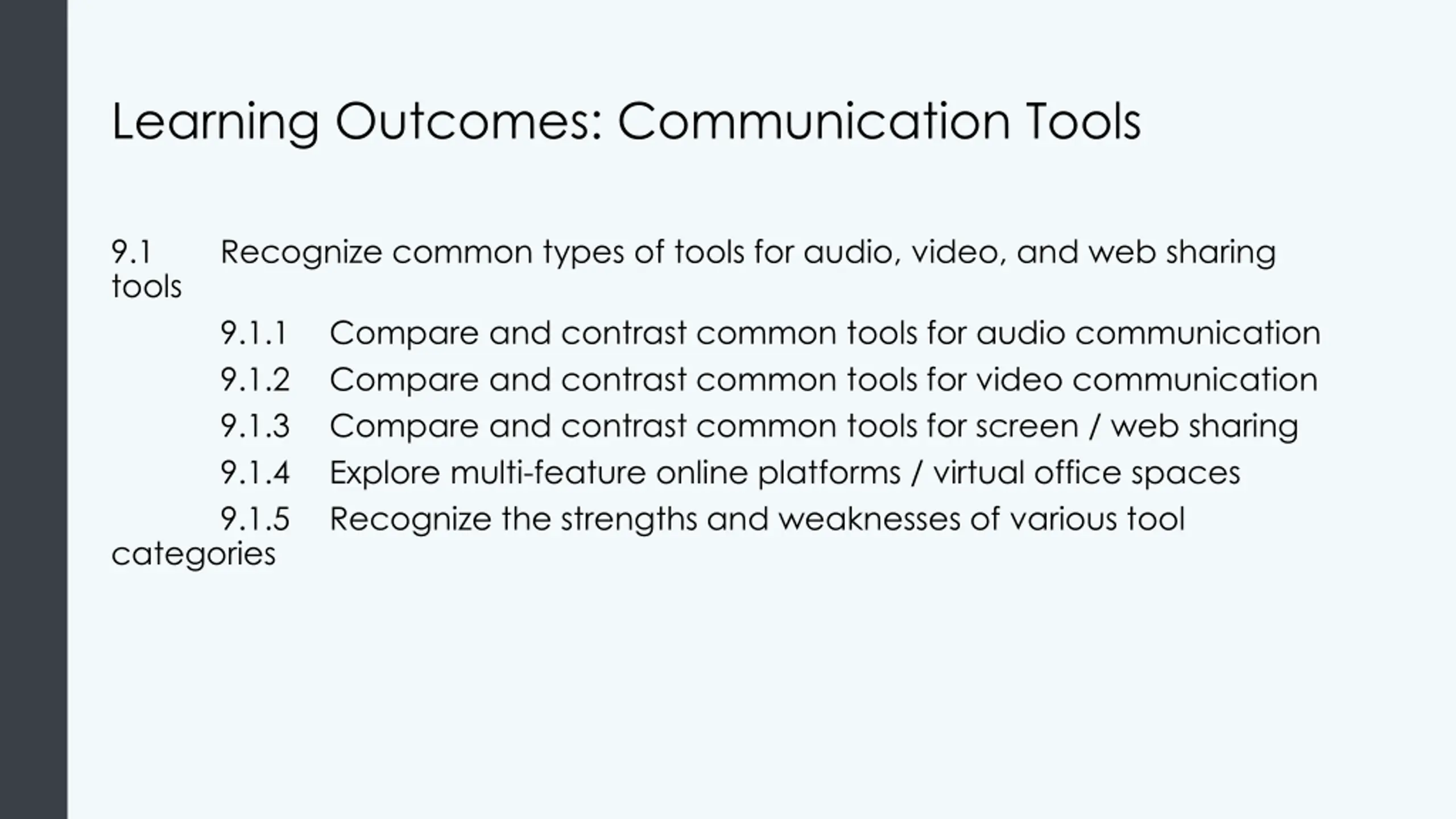 Learning Outcomes: Communication Tools 9.1 tools Recognize common types of tools for audio, video, and web sharing 9.1.1 9.1.2 9.1.3 9.1.4 9.1.5 Compare and contrast common tools for audio communication Compare and contrast common tools for video communication Compare and contrast common tools for screen / web sharing Explore multi-feature online platforms / virtual office spaces Recognize the strengths and weaknesses of various tool categories