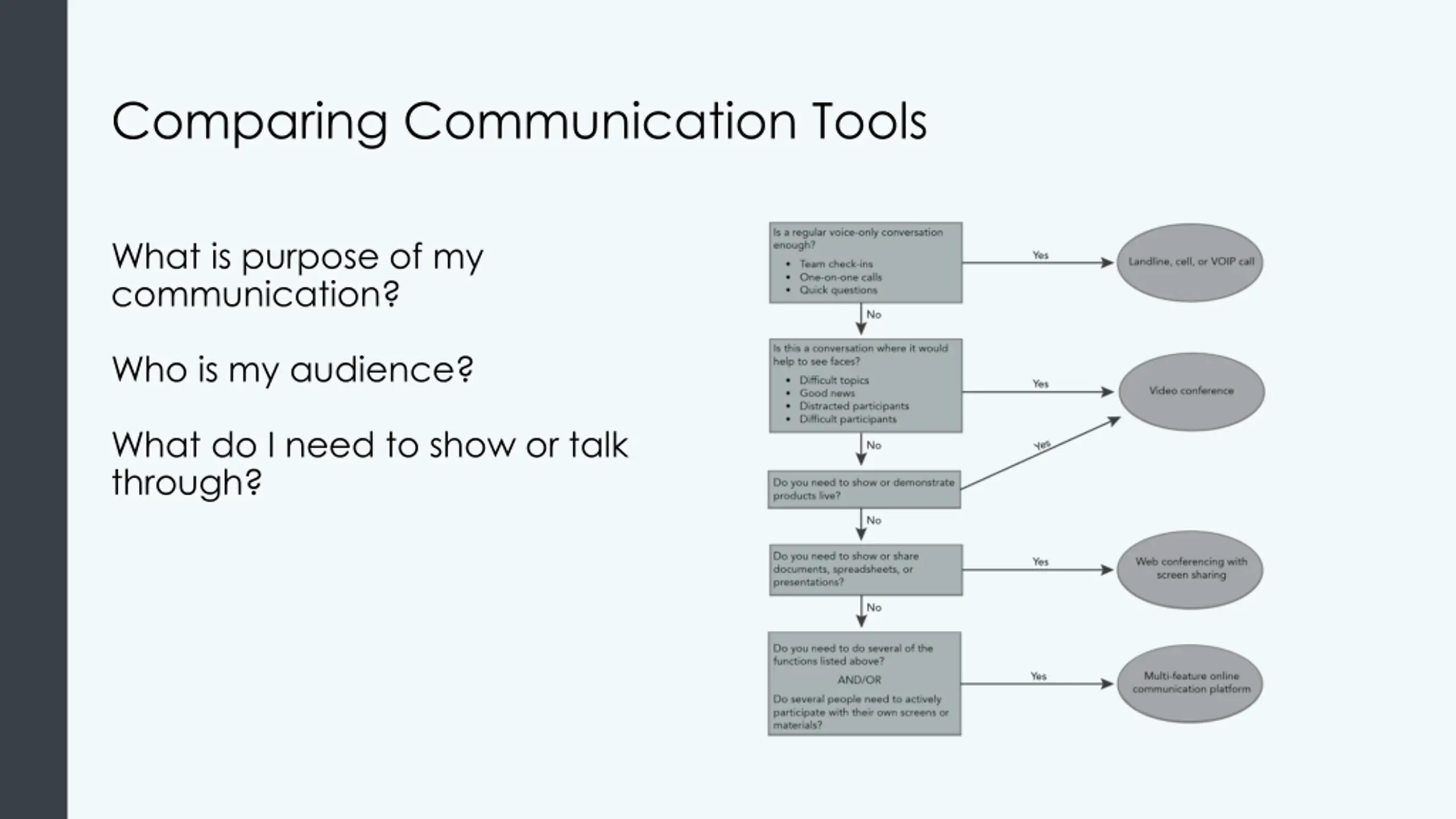 Comparing Communication Tools What is purpose of my communication? Who is my audience? What do I need to show or talk through?