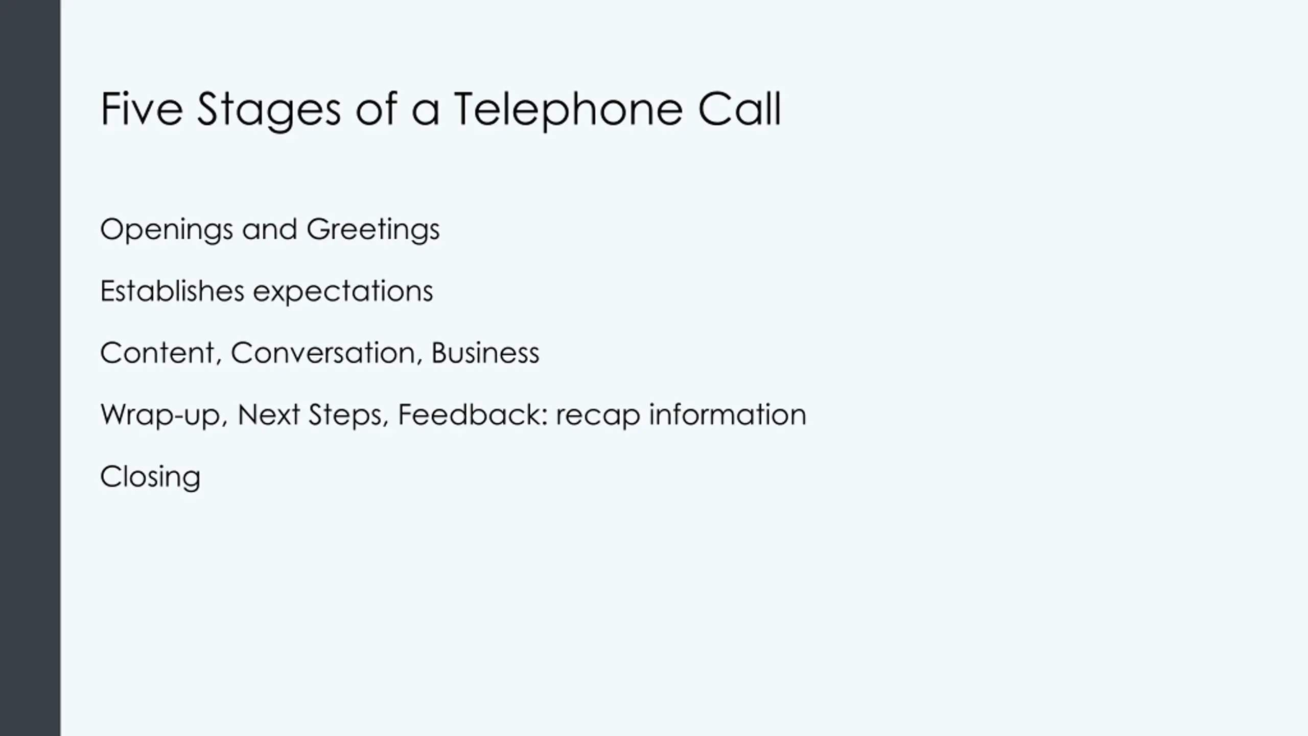 Five Stages of a Telephone Call Openings and Greetings Establishes expectations Content, Conversation, Business Wrap-up, Next Steps, Feedback: recap information Closing