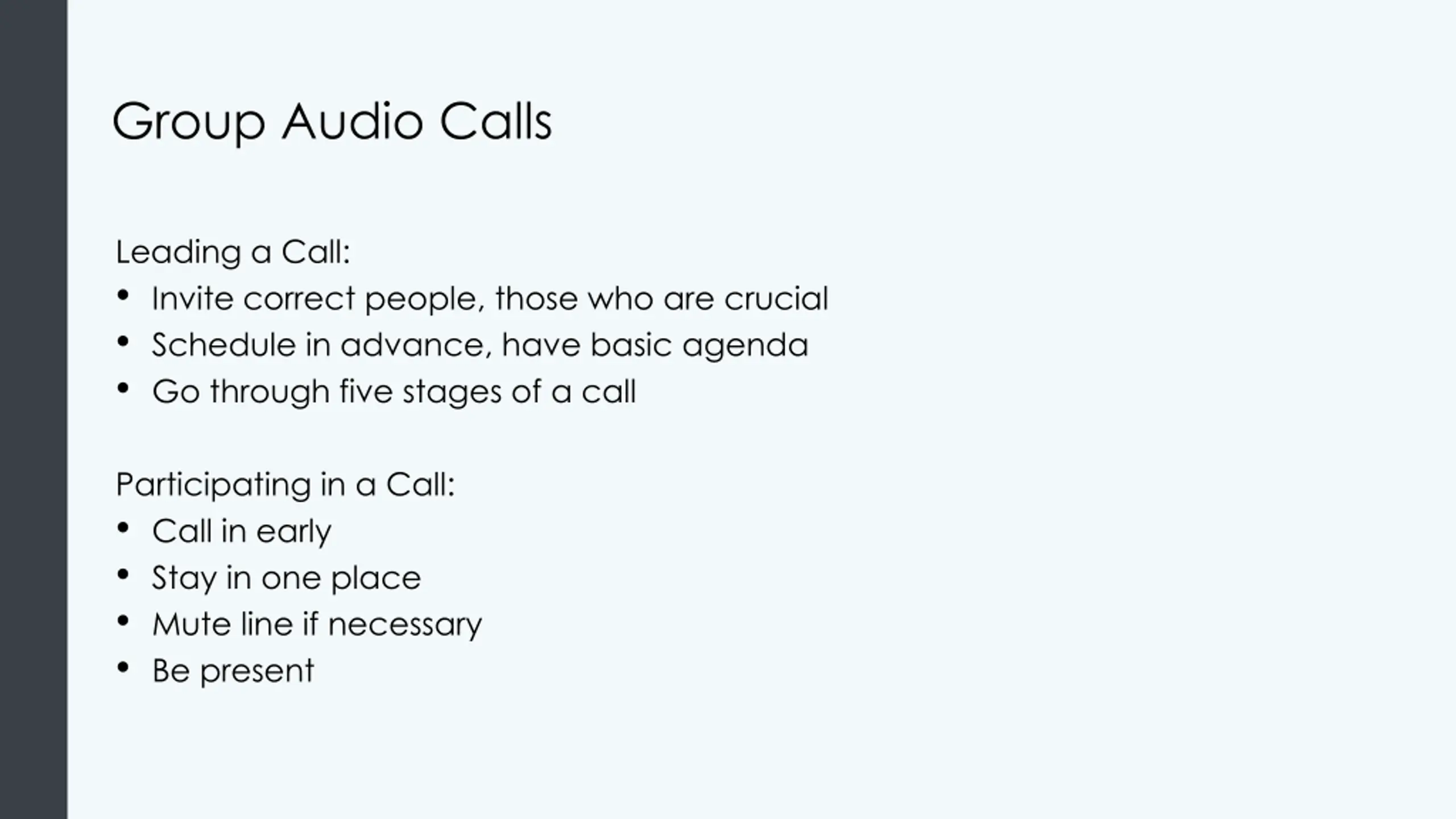 Group Audio Calls Leading a Call: Invite correct people, those who are crucial Schedule in advance, have basic agenda Go through five stages of a call Participating in a Call: Call in early Stay in one place Mute line if necessary Be present