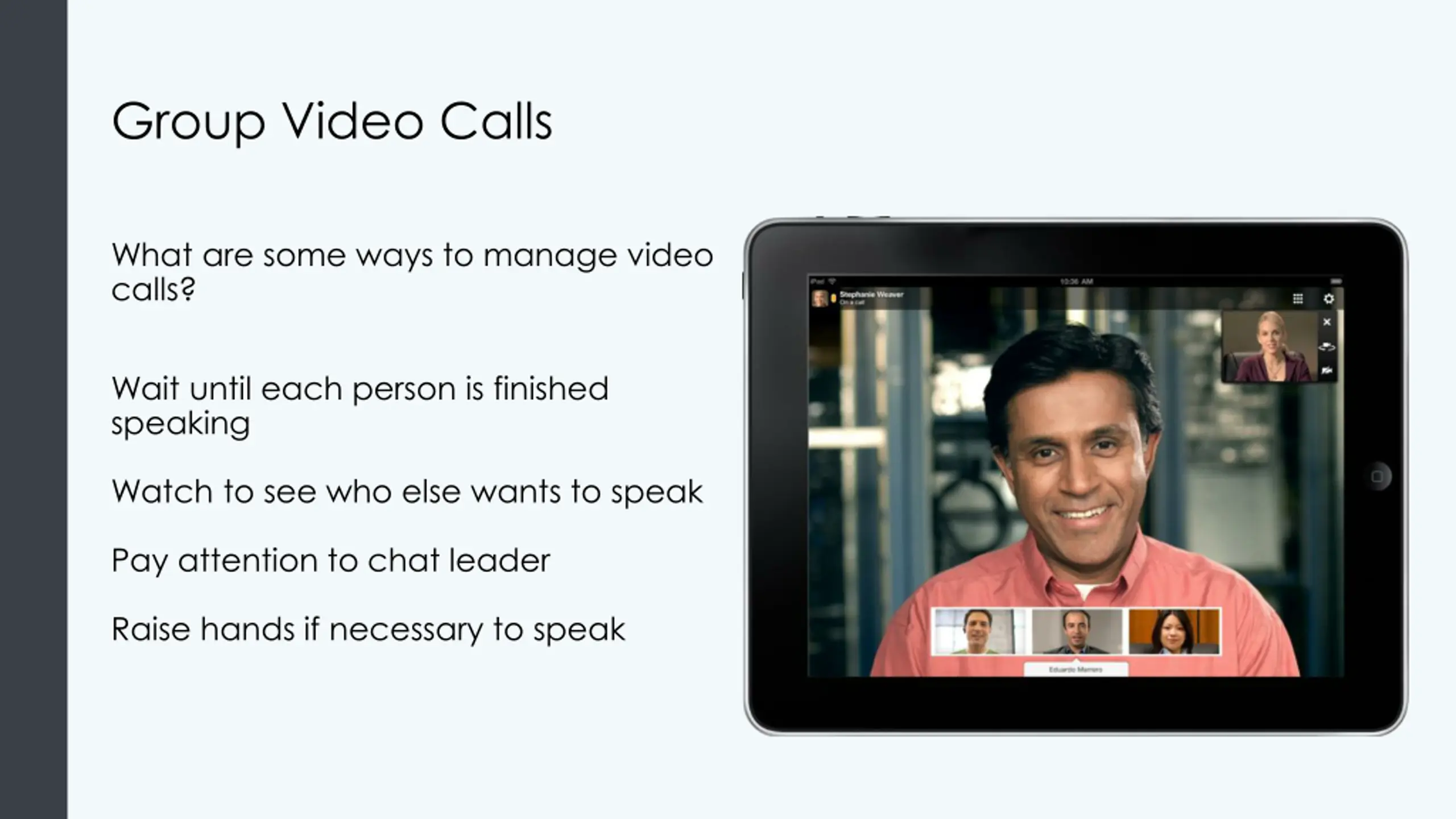 Group Video Calls What are some ways to manage video calls? Wait until each person is finished speaking Watch to see who else wants to speak Pay attention to chat leader Raise hands if necessary to speak