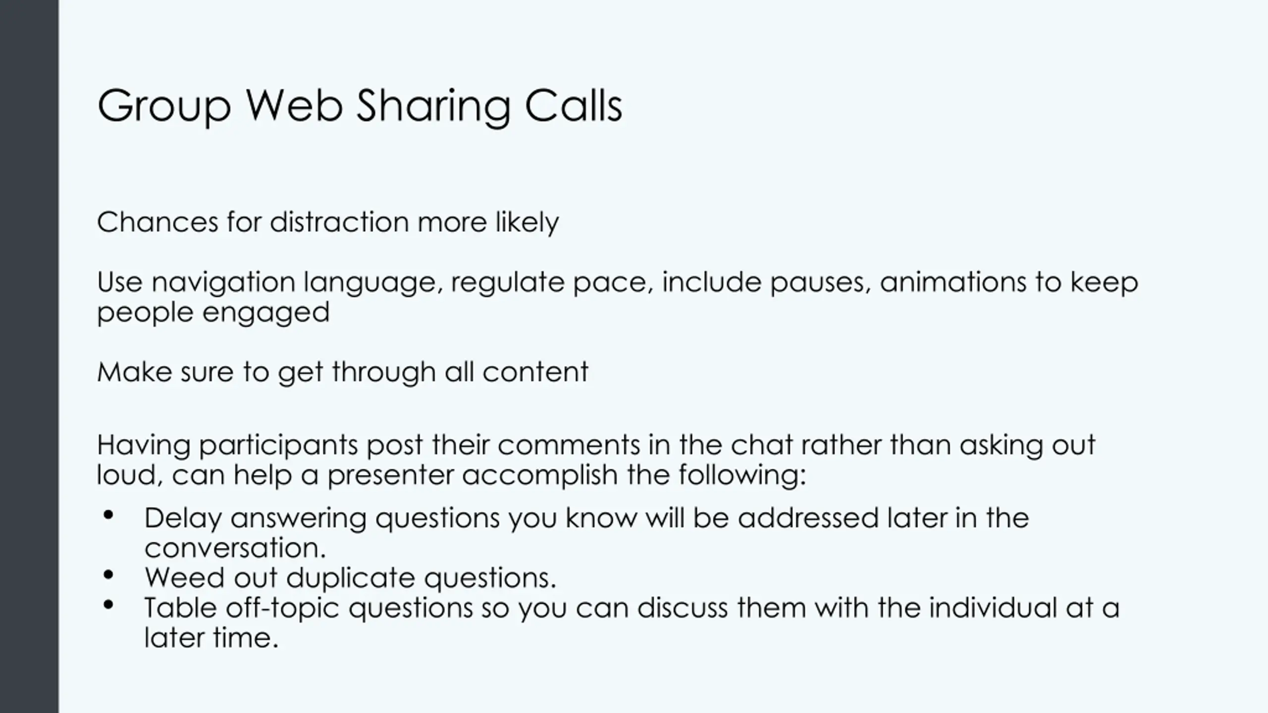 Group Web Sharing Calls Chances for distraction more likely Use navigation language, regulate pace, include pauses, animations to keep people engaged Make sure to get through all content Having participants post their comments in the chat rather than asking out loud, can help a presenter accomplish the following: Delay answering questions you know will be addressed later in the conversation. Weed out duplicate questions. Table off-topic questions so you can discuss them with the individual at a later time.