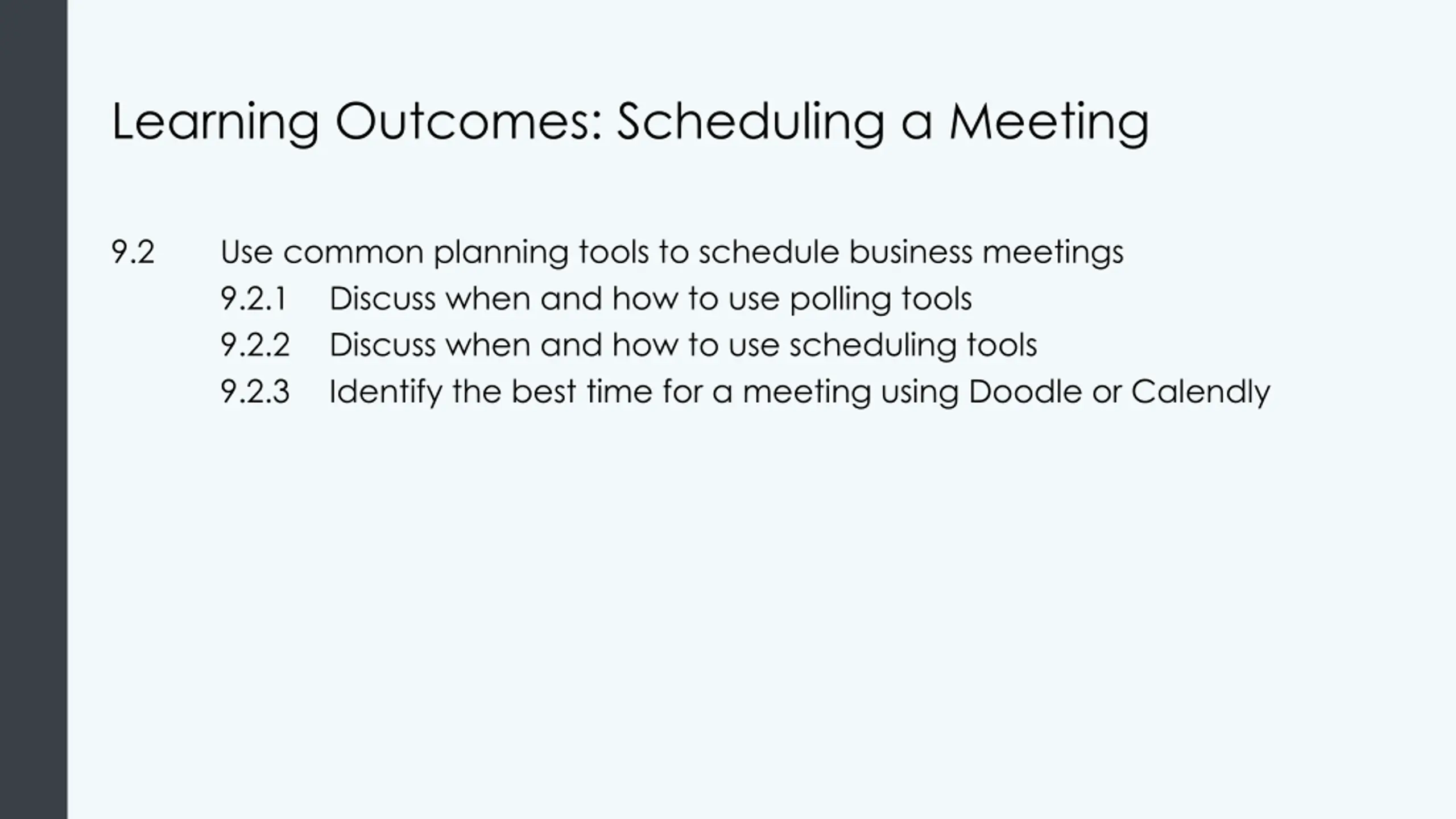 Learning Outcomes: Scheduling a Meeting 9.2 Use common planning tools to schedule business meetings 9.2.1 Discuss when and how to use polling tools 9.2.2 Discuss when and how to use scheduling tools 9.2.3 Identify the best time for a meeting using Doodle or Calendly