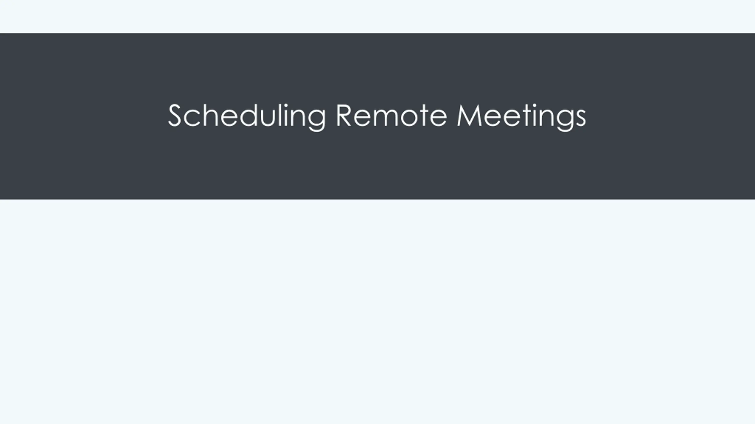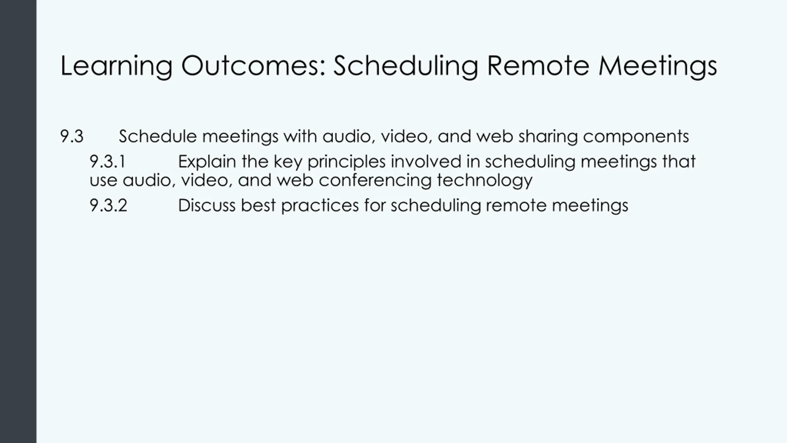 Learning Outcomes: Scheduling Remote Meetings 9.3 Schedule meetings with audio, video, and web sharing components 9.3.1 Explain the key principles involved in scheduling meetings that use audio, video, and web conferencing technology 9.3.2 Discuss best practices for scheduling remote meetings