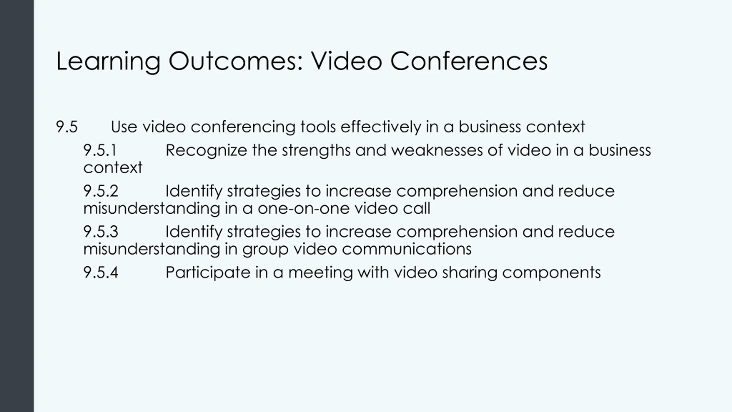 Learning Outcomes: Video Conferences 9.5 Use video conferencing tools effectively in a business context 9.5.1 Recognize the strengths and weaknesses of video in a business context 9.5.2 Identify strategies to increase comprehension and reduce misunderstanding in a one-on-one video call 9.5.3 Identify strategies to increase comprehension and reduce misunderstanding in group video communications 9.5.4 Participate in a meeting with video sharing components