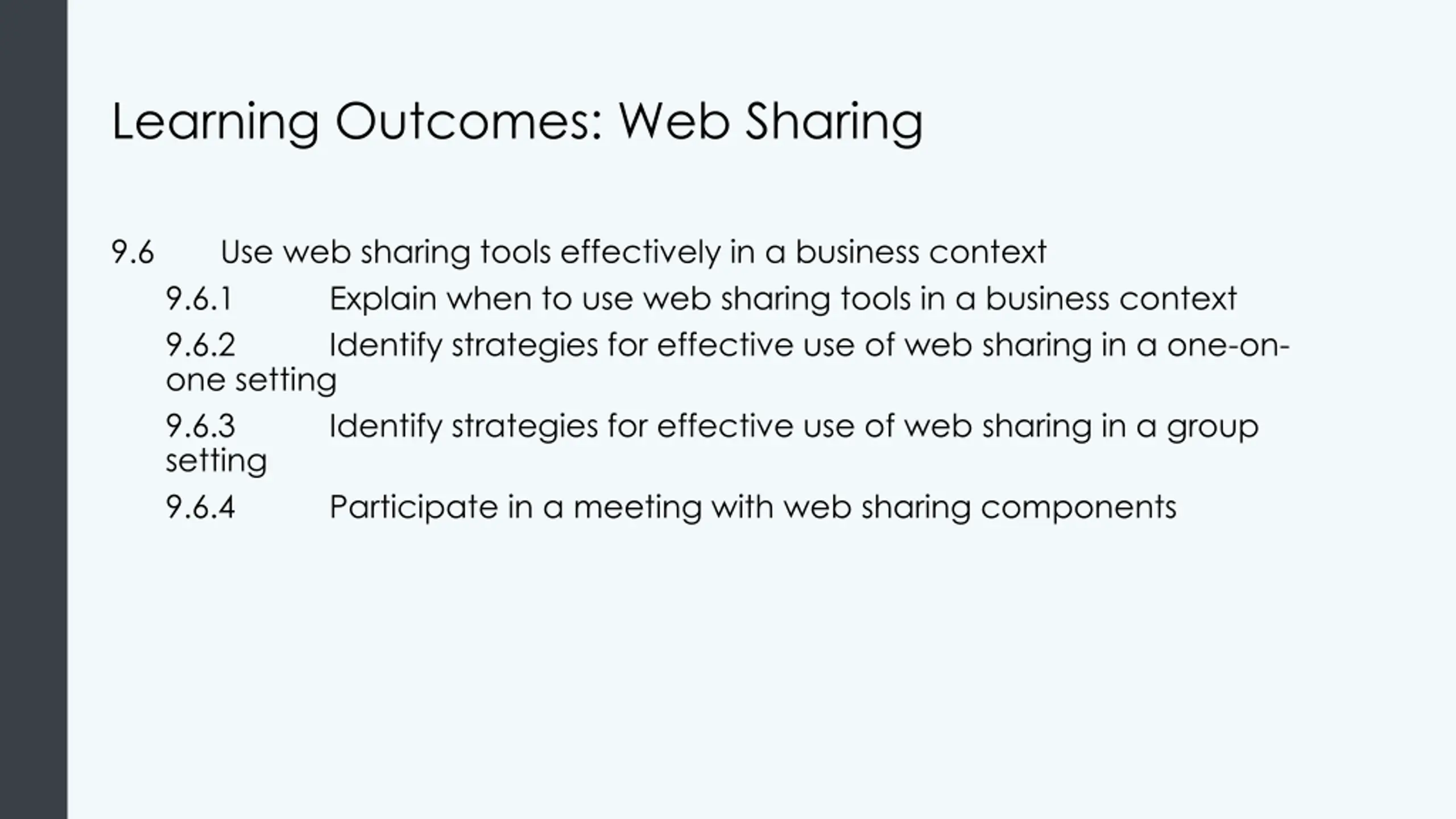 Learning Outcomes: Web Sharing 9.6 Use web sharing tools effectively in a business context 9.6.1 Explain when to use web sharing tools in a business context 9.6.2 Identify strategies for effective use of web sharing in a one-on- one setting 9.6.3 Identify strategies for effective use of web sharing in a group setting 9.6.4 Participate in a meeting with web sharing components