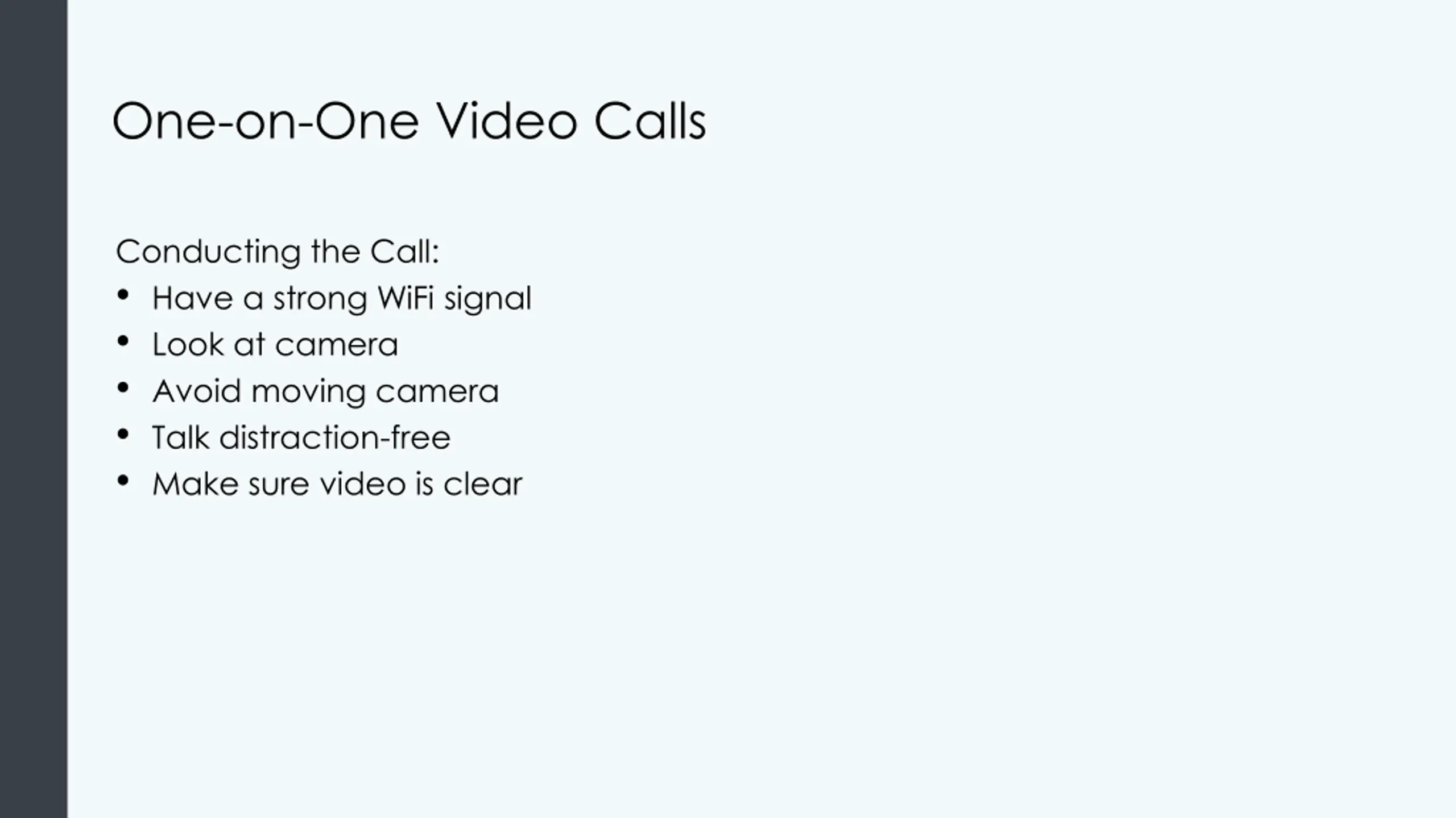 One-on-One Video Calls Conducting the Call: Have a strong WiFi signal Look at camera Avoid moving camera Talk distraction-free Make sure video is clear