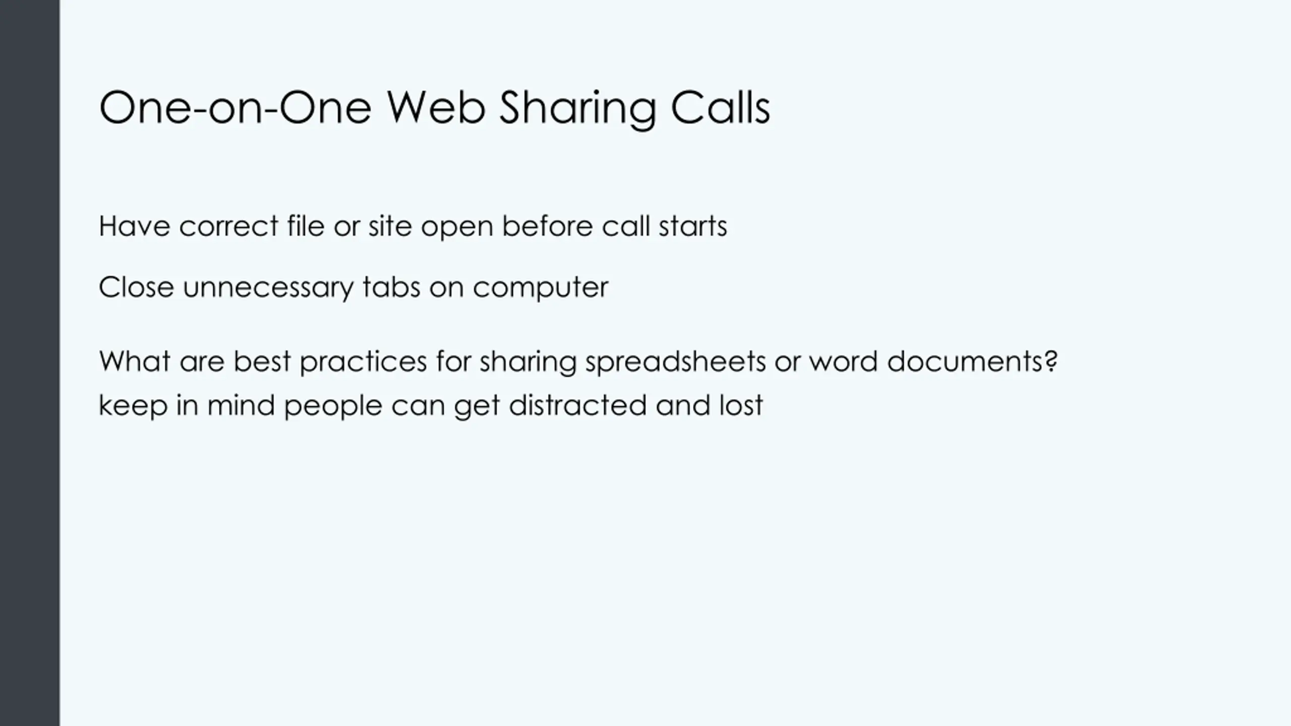 One-on-One Web Sharing Calls Have correct file or site open before call starts Close unnecessary tabs on computer What are best practices for sharing spreadsheets or word documents? keep in mind people can get distracted and lost