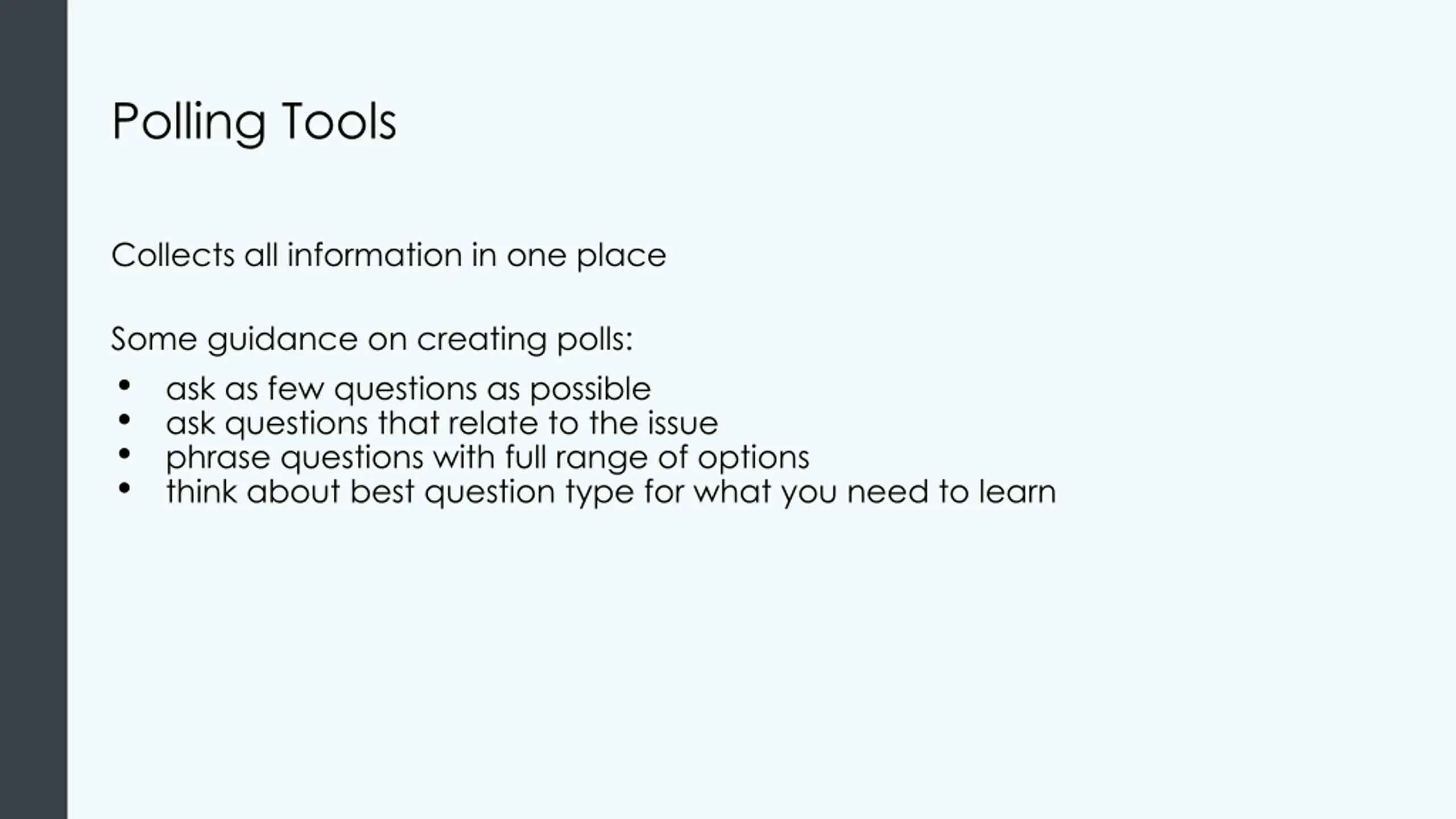Polling Tools Collects all information in one place Some guidance on creating polls: ask as few questions as possible ask questions that relate to the issue phrase questions with full range of options think about best question type for what you need to learn