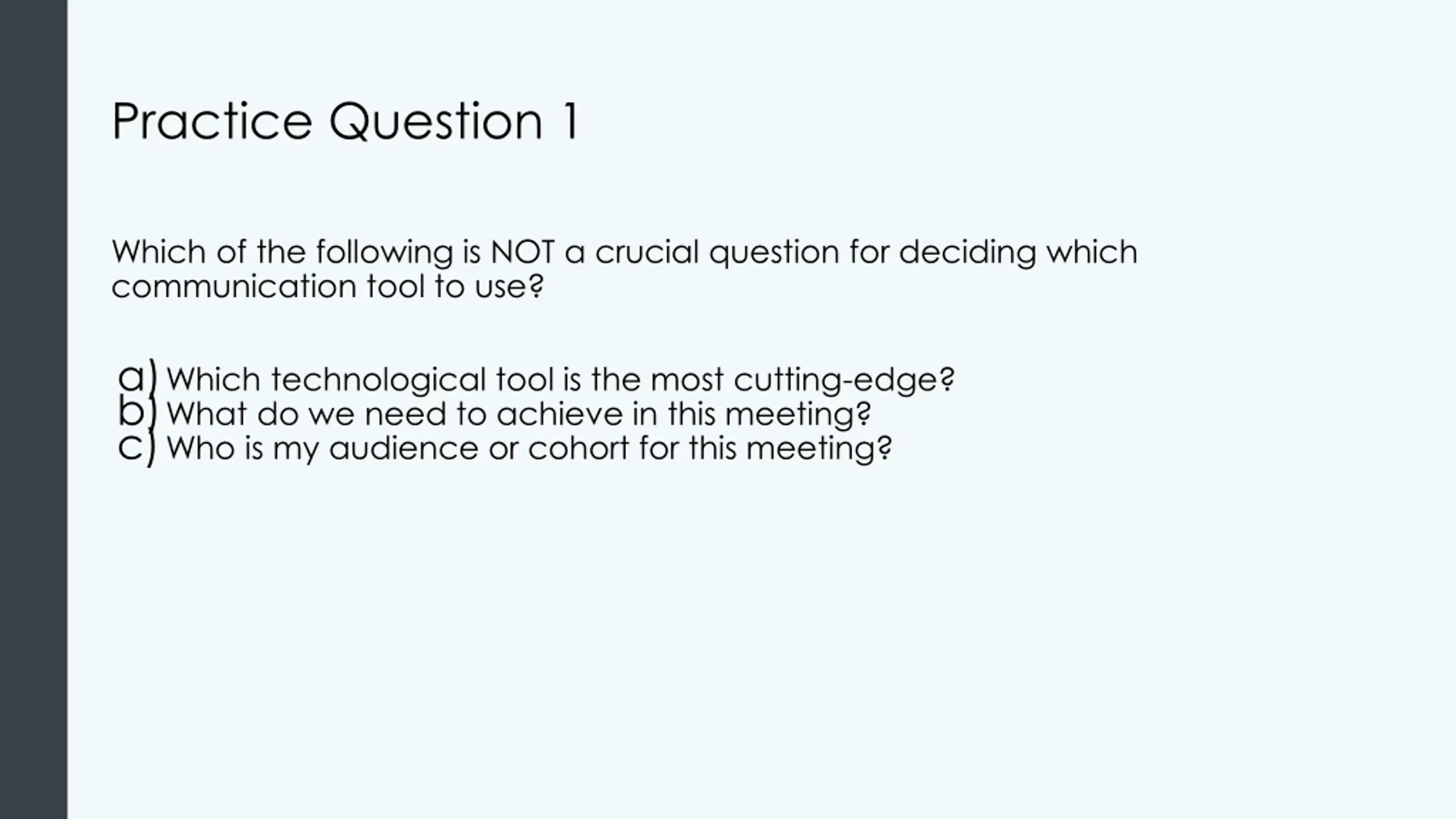 Practice Question 1 Which of the following is NOT a crucial question for deciding which communication tool to use? a)Which technological tool is the most cutting-edge? b)What do we need to achieve in this meeting? c)Who is my audience or cohort for this meeting?