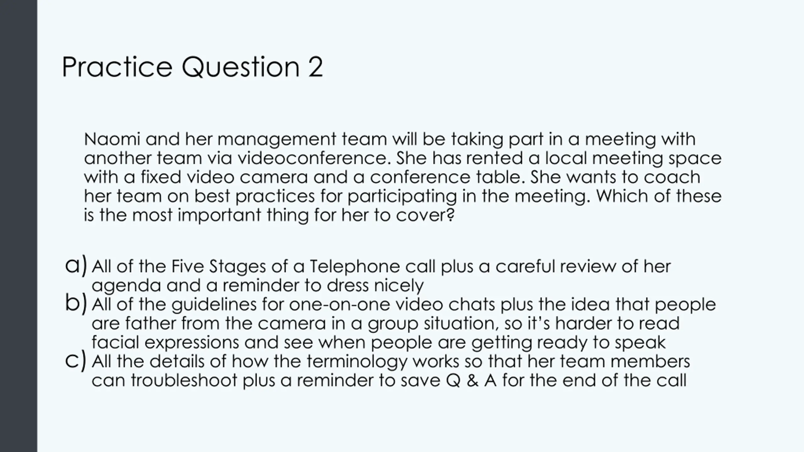 Practice Question 2 Naomi and her management team will be taking part in a meeting with another team via videoconference. She has rented a local meeting space with a fixed video camera and a conference table. She wants to coach her team on best practices for participating in the meeting. Which of these is the most important thing for her to cover? a)All of the Five Stages of a Telephone call plus a careful review of her agenda and a reminder to dress nicely b)All of the guidelines for one-on-one video chats plus the idea that people are father from the camera in a group situation, so it s harder to read facial expressions and see when people are getting ready to speak c)All the details of how the terminology works so that her team members can troubleshoot plus a reminder to save Q & A for the end of the call