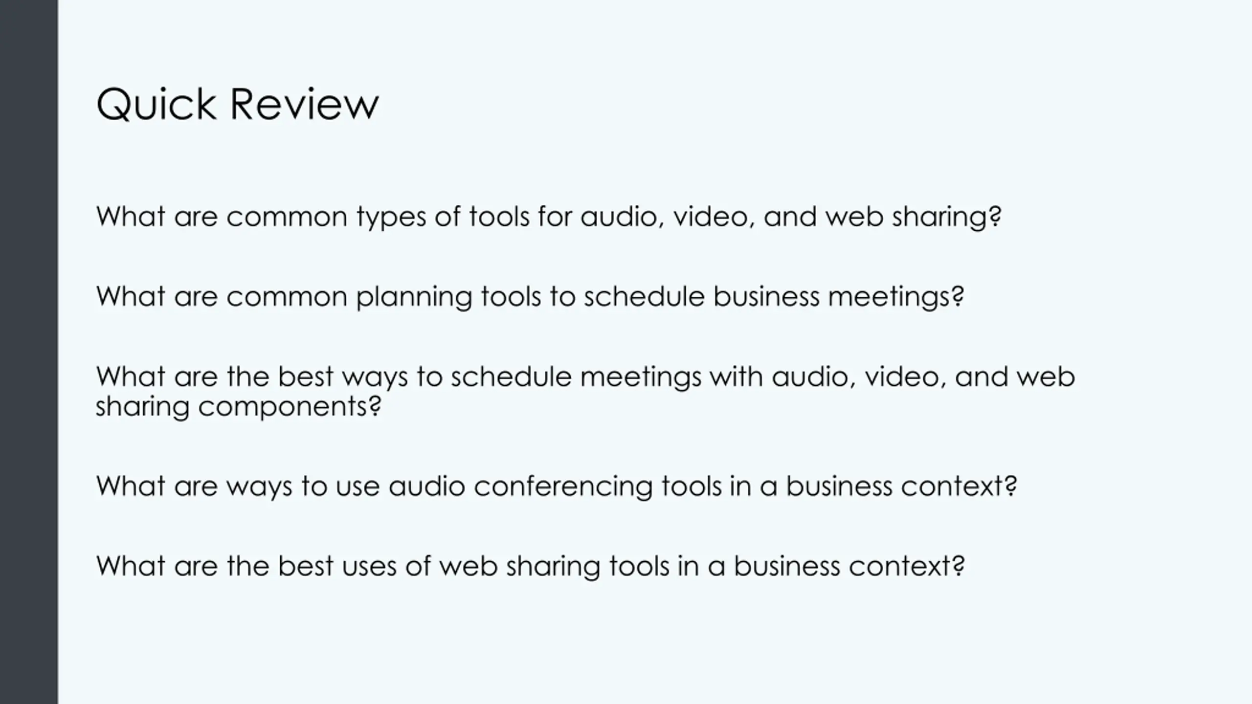 Quick Review What are common types of tools for audio, video, and web sharing? What are common planning tools to schedule business meetings? What are the best ways to schedule meetings with audio, video, and web sharing components? What are ways to use audio conferencing tools in a business context? What are the best uses of web sharing tools in a business context?