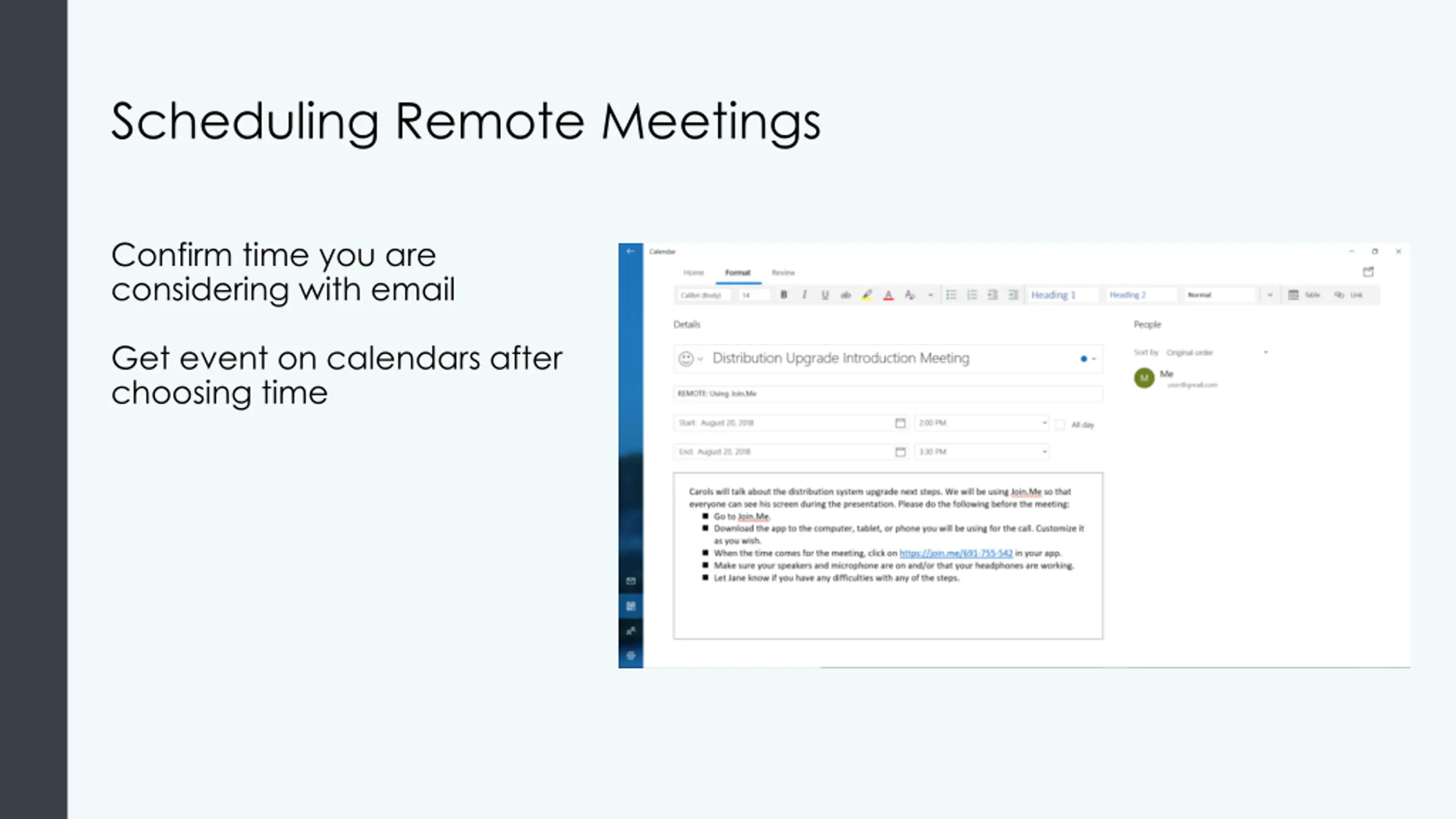 Scheduling Remote Meetings Confirm time you are considering with email Get event on calendars after choosing time