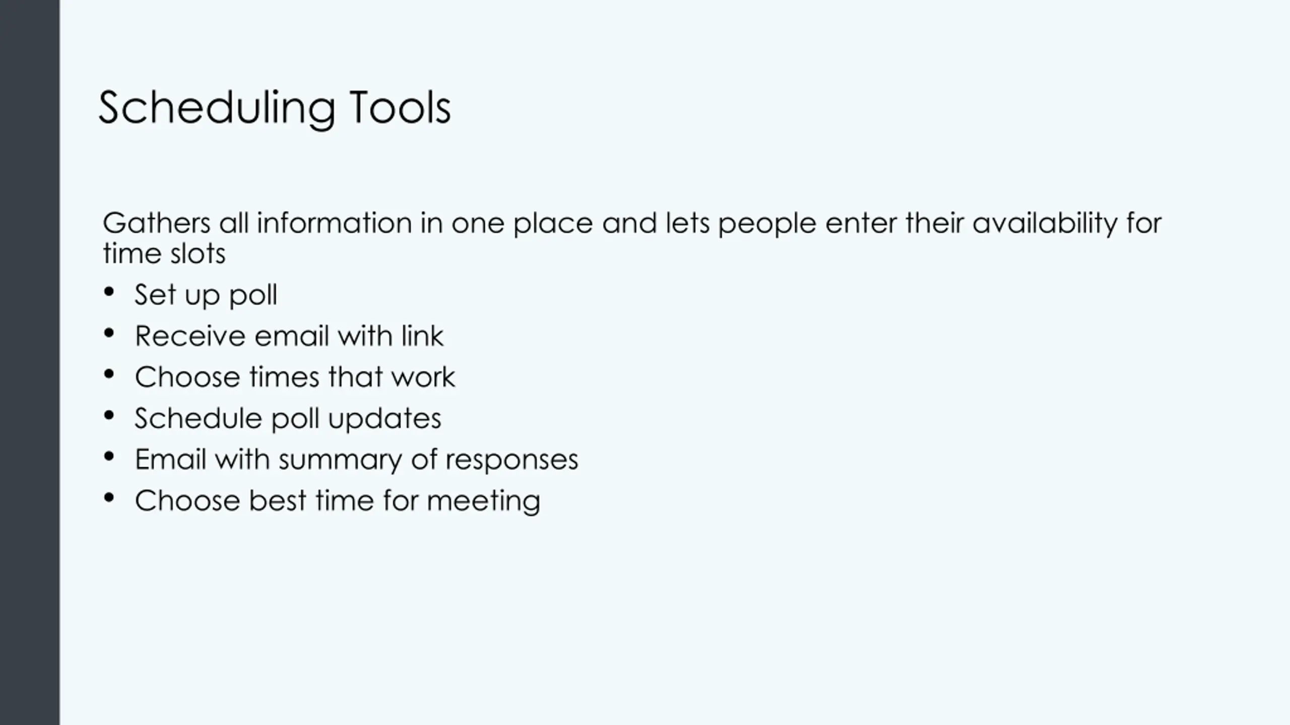 Scheduling Tools Gathers all information in one place and lets people enter their availability for time slots Set up poll Receive email with link Choose times that work Schedule poll updates Email with summary of responses Choose best time for meeting