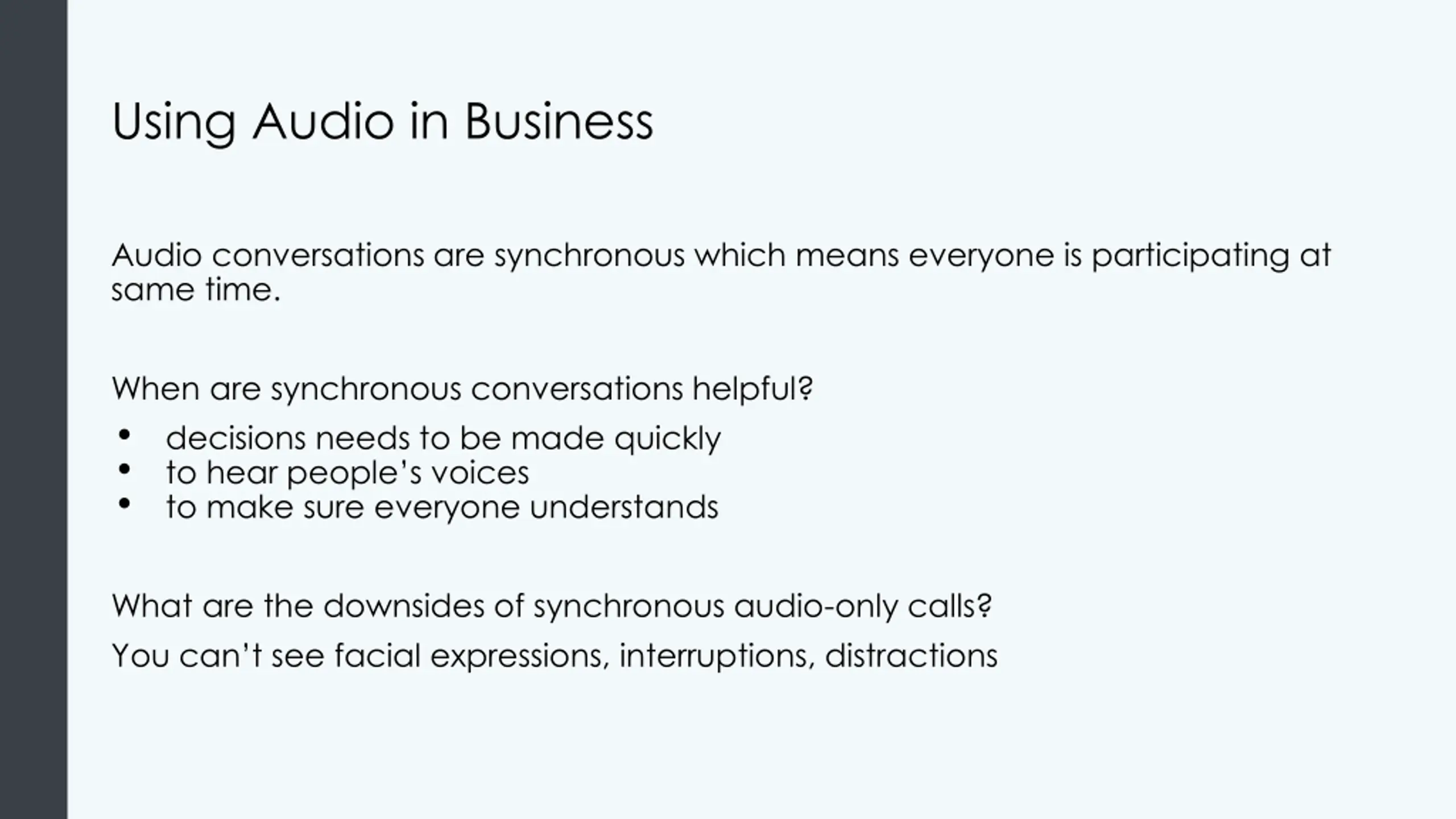 Using Audio in Business Audio conversations are synchronous which means everyone is participating at same time. When are synchronous conversations helpful? decisions needs to be made quickly to hear people s voices to make sure everyone understands What are the downsides of synchronous audio-only calls? You can t see facial expressions, interruptions, distractions