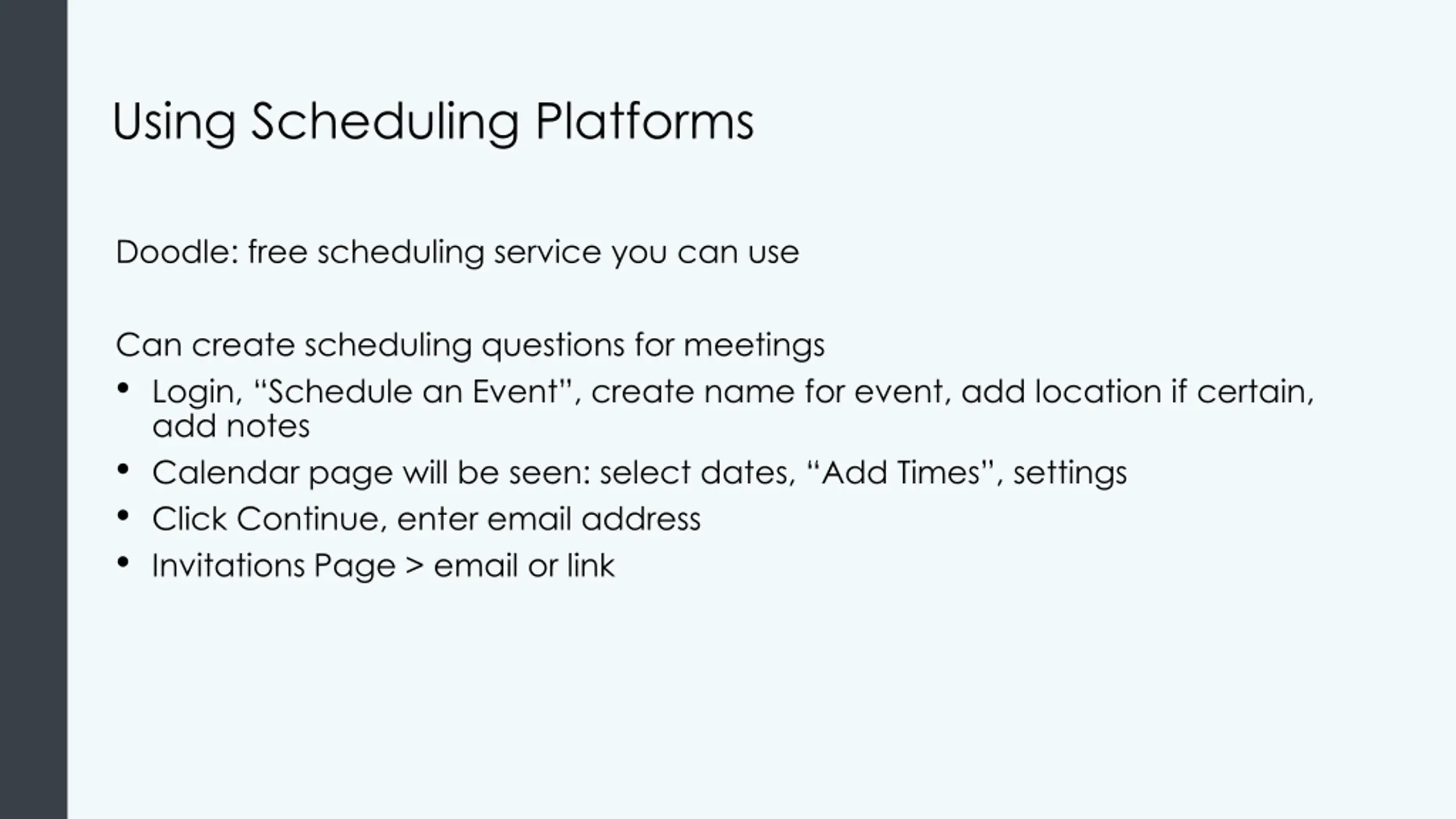 Using Scheduling Platforms Doodle: free scheduling service you can use Can create scheduling questions for meetings Login, Schedule an Event , create name for event, add location if certain, add notes Calendar page will be seen: select dates, Add Times , settings Click Continue, enter email address Invitations Page > email or link