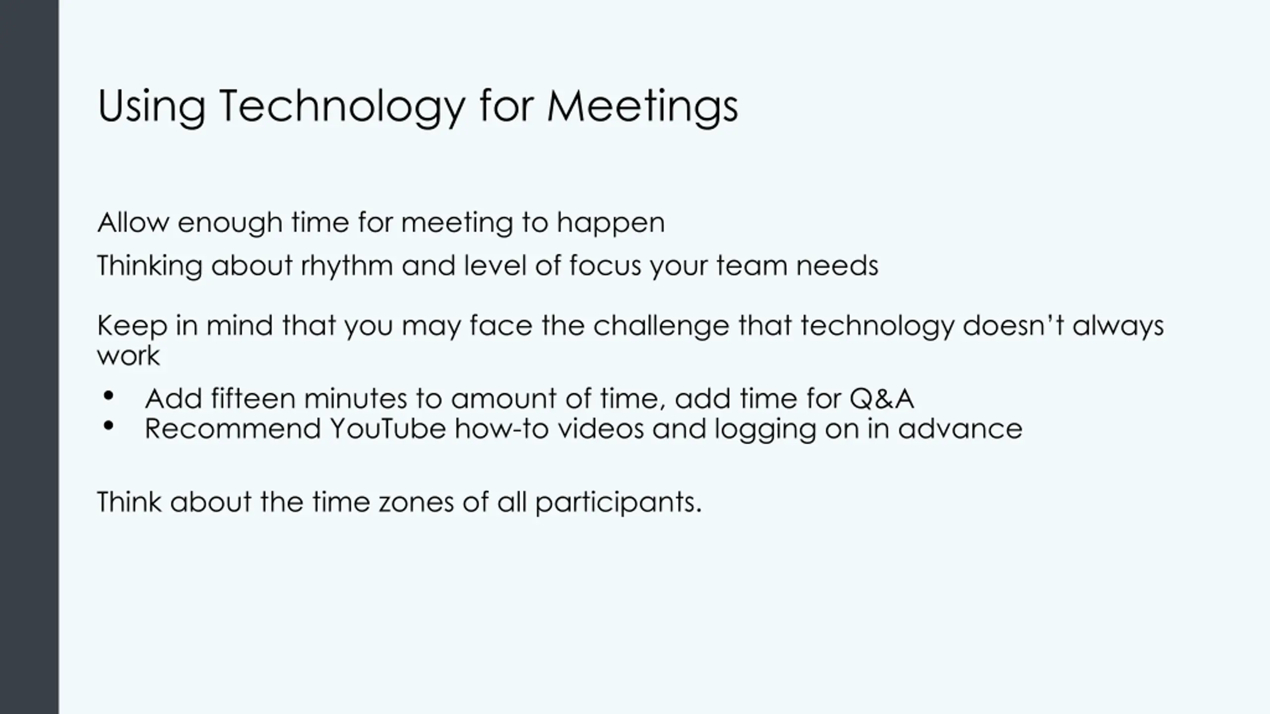 Using Technology for Meetings Allow enough time for meeting to happen Thinking about rhythm and level of focus your team needs Keep in mind that you may face the challenge that technology doesn t always work Add fifteen minutes to amount of time, add time for Q&A Recommend YouTube how-to videos and logging on in advance Think about the time zones of all participants.