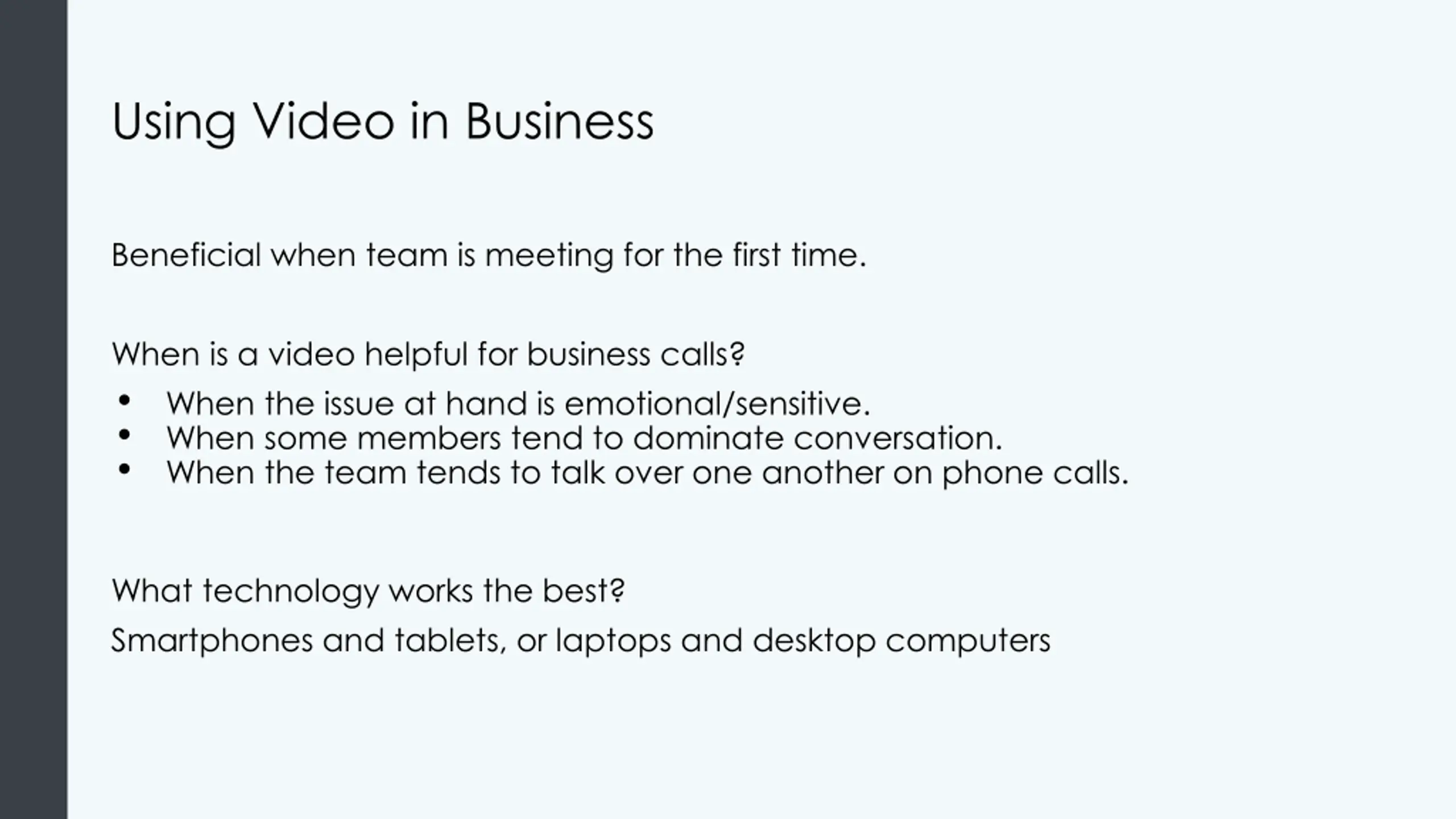 Using Video in Business Beneficial when team is meeting for the first time. When is a video helpful for business calls? When the issue at hand is emotional/sensitive. When some members tend to dominate conversation. When the team tends to talk over one another on phone calls. What technology works the best? Smartphones and tablets, or laptops and desktop computers