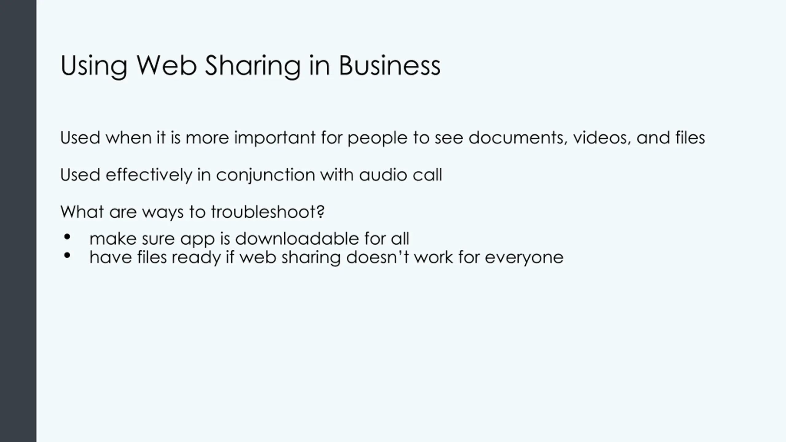 Using Web Sharing in Business Used when it is more important for people to see documents, videos, and files Used effectively in conjunction with audio call What are ways to troubleshoot? make sure app is downloadable for all have files ready if web sharing doesn t work for everyone