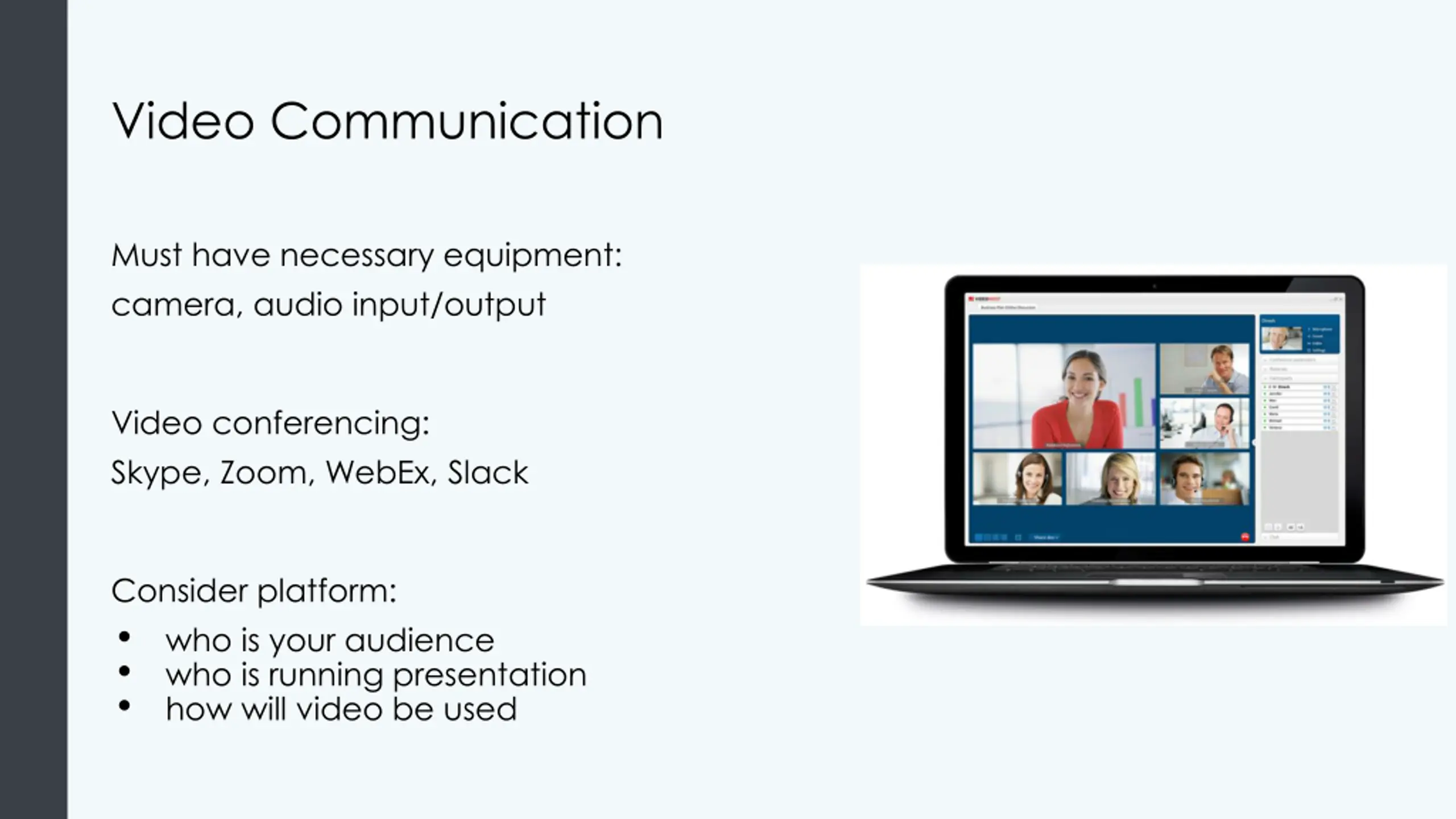 Video Communication Must have necessary equipment: camera, audio input/output Video conferencing: Skype, Zoom, WebEx, Slack Consider platform: who is your audience who is running presentation how will video be used