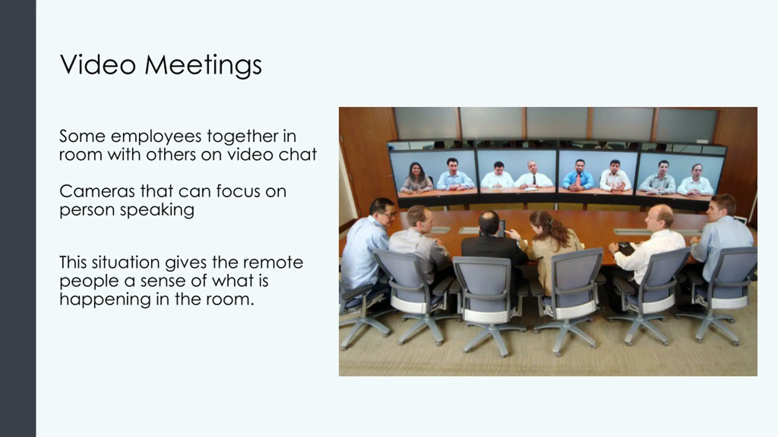 Video Meetings Some employees together in room with others on video chat Cameras that can focus on person speaking This situation gives the remote people a sense of what is happening in the room.