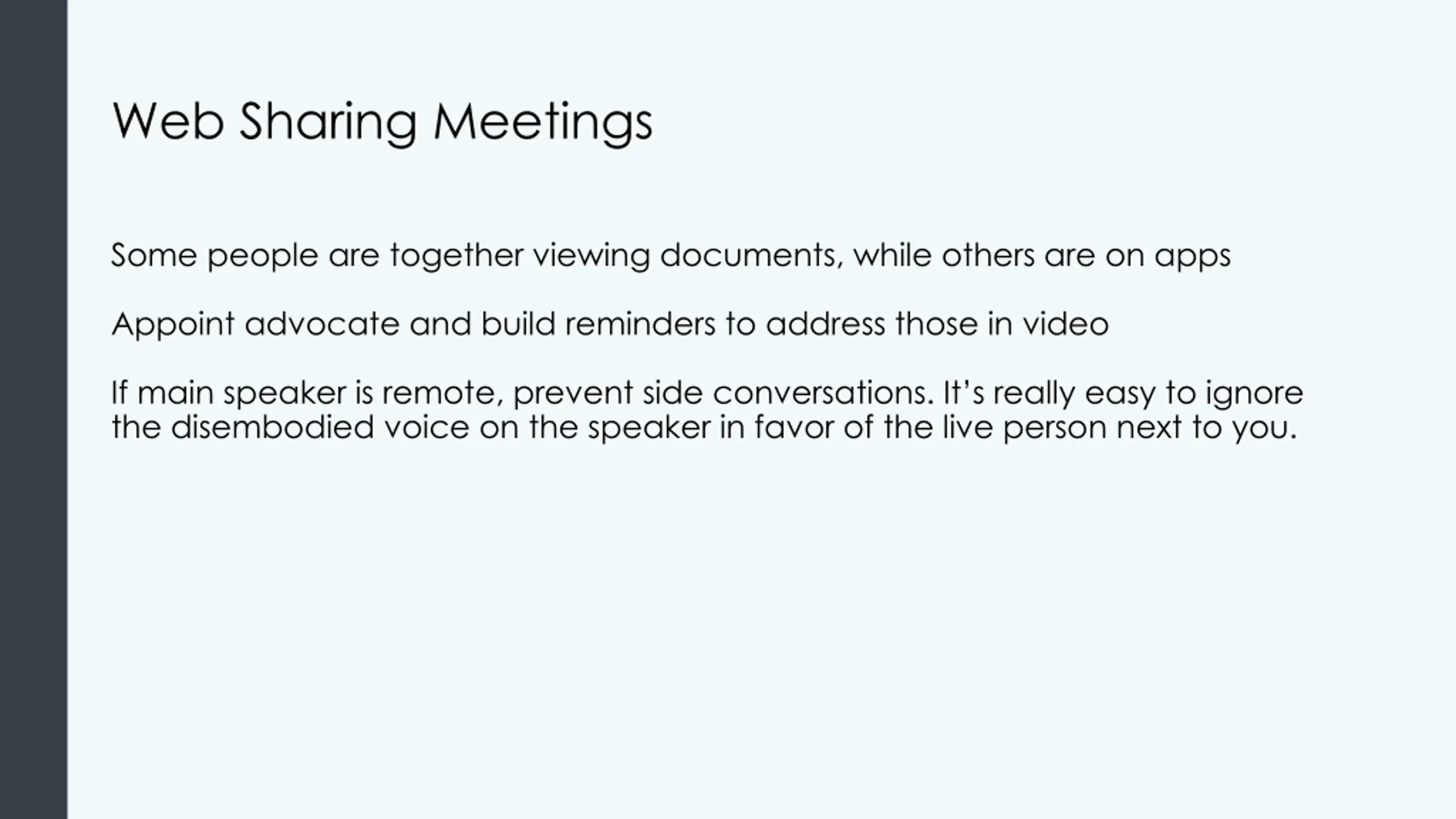 Web Sharing Meetings Some people are together viewing documents, while others are on apps Appoint advocate and build reminders to address those in video If main speaker is remote, prevent side conversations. It s really easy to ignore the disembodied voice on the speaker in favor of the live person next to you.