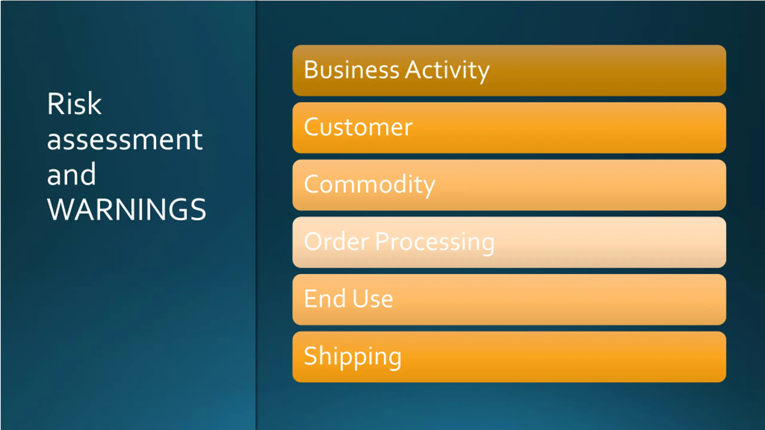 Business Activity Risk assessment and WARNINGS Customer Commodity Order Processing End Use Shipping