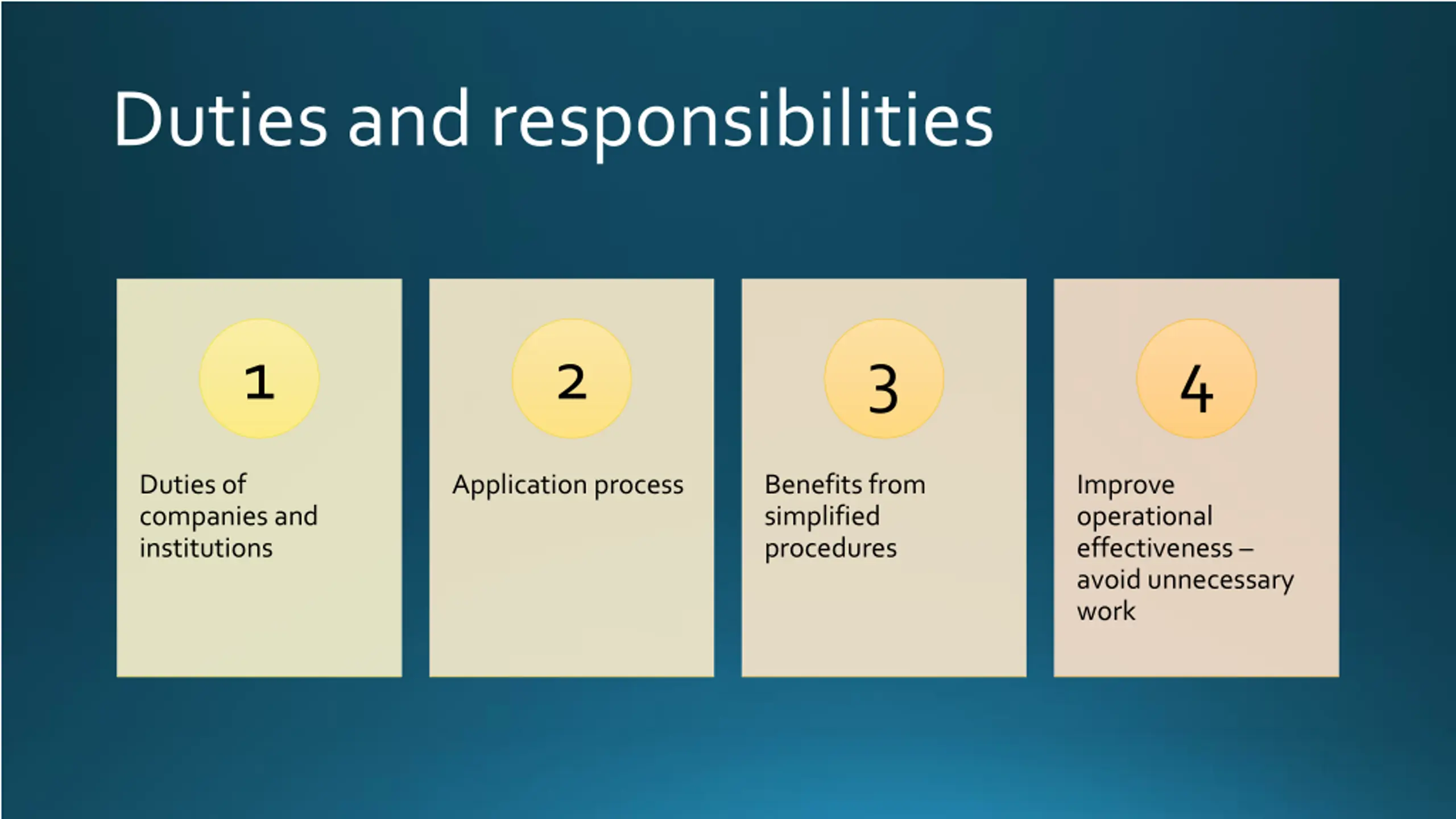 Duties and responsibilities 1 2 3 4 Duties of companies and institutions Application process Benefits from simplified procedures Improve operational effectiveness avoid unnecessary work