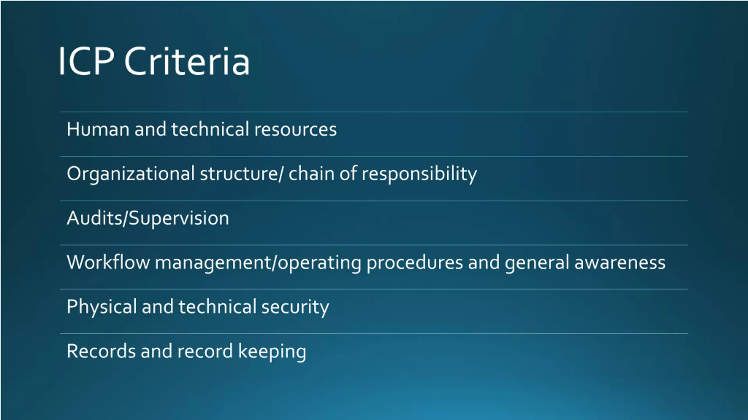 ICP Criteria Human and technical resources Organizational structure/ chain of responsibility Audits/Supervision Workflow management/operating procedures and general awareness Physical and technical security Records and record keeping