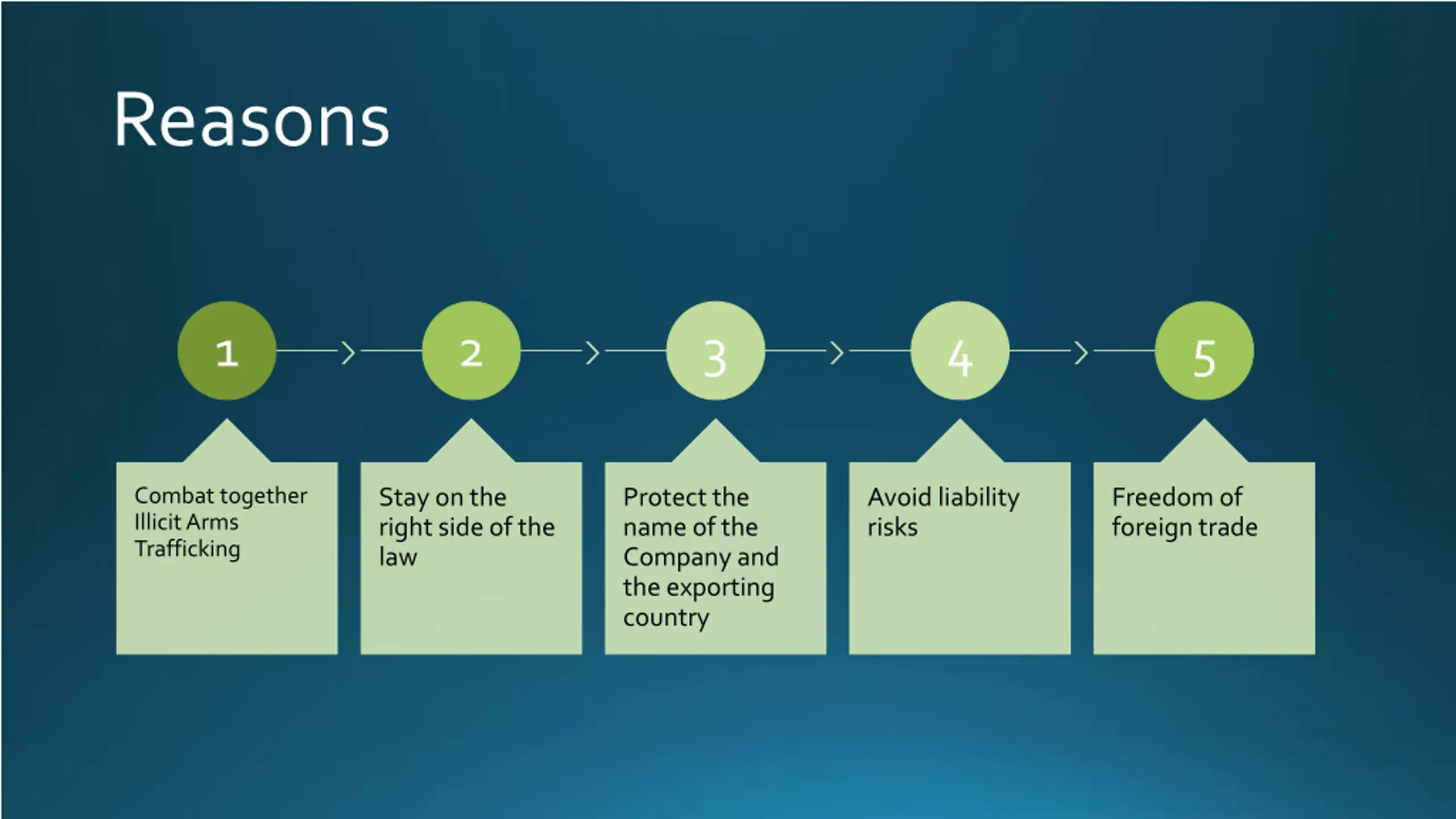 Reasons 1 2 3 4 5 Combat together Illicit Arms Trafficking Stay on the right side of the law Protect the name of the Company and the exporting country Avoid liability risks Freedom of foreign trade