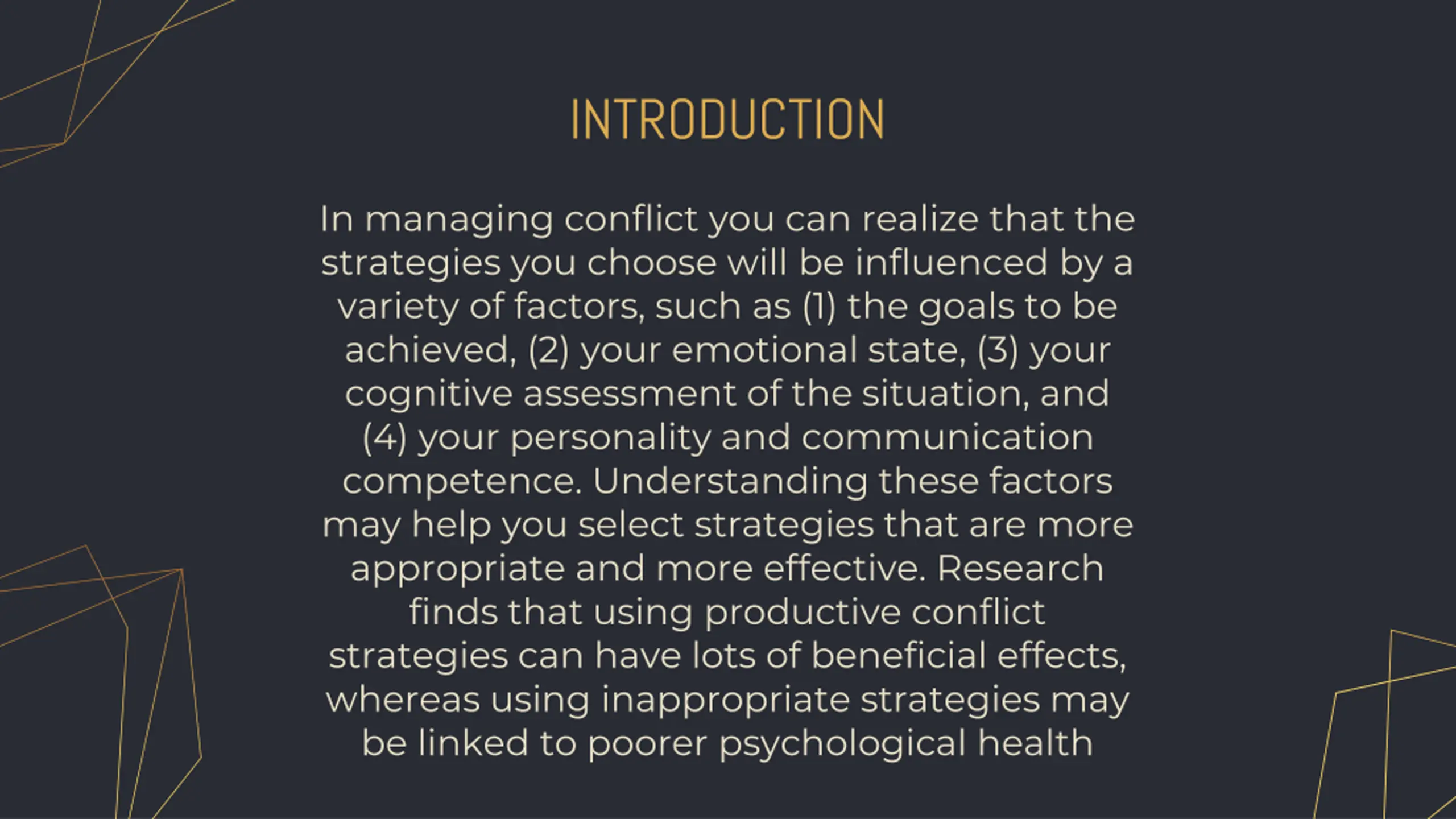 INTRODUCTION In managing conflict you can realize that the strategies you choose will be influenced by a variety of factors, such as (1) the goals to be achieved, (2) your emotional state, (3) your cognitive assessment of the situation, and (4) your personality and communication competence. Understanding these factors may help you select strategies that are more appropriate and more effective. Research finds that using productive conflict strategies can have lots of beneficial effects, whereas using inappropriate strategies may be linked to poorer psychological health