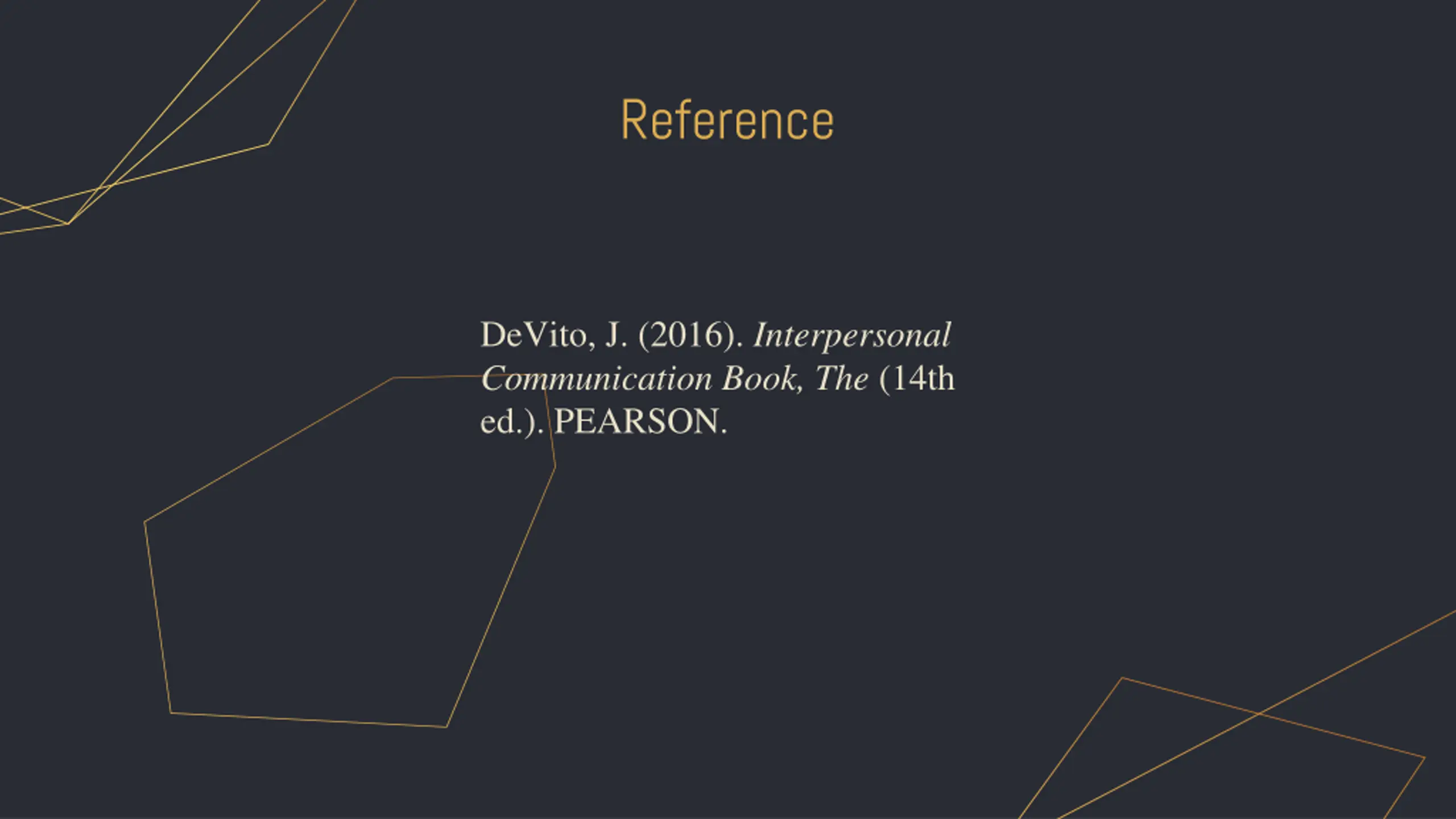 Reference DeVito, J. (2016). Interpersonal Communication Book, The (14th ed.). PEARSON.