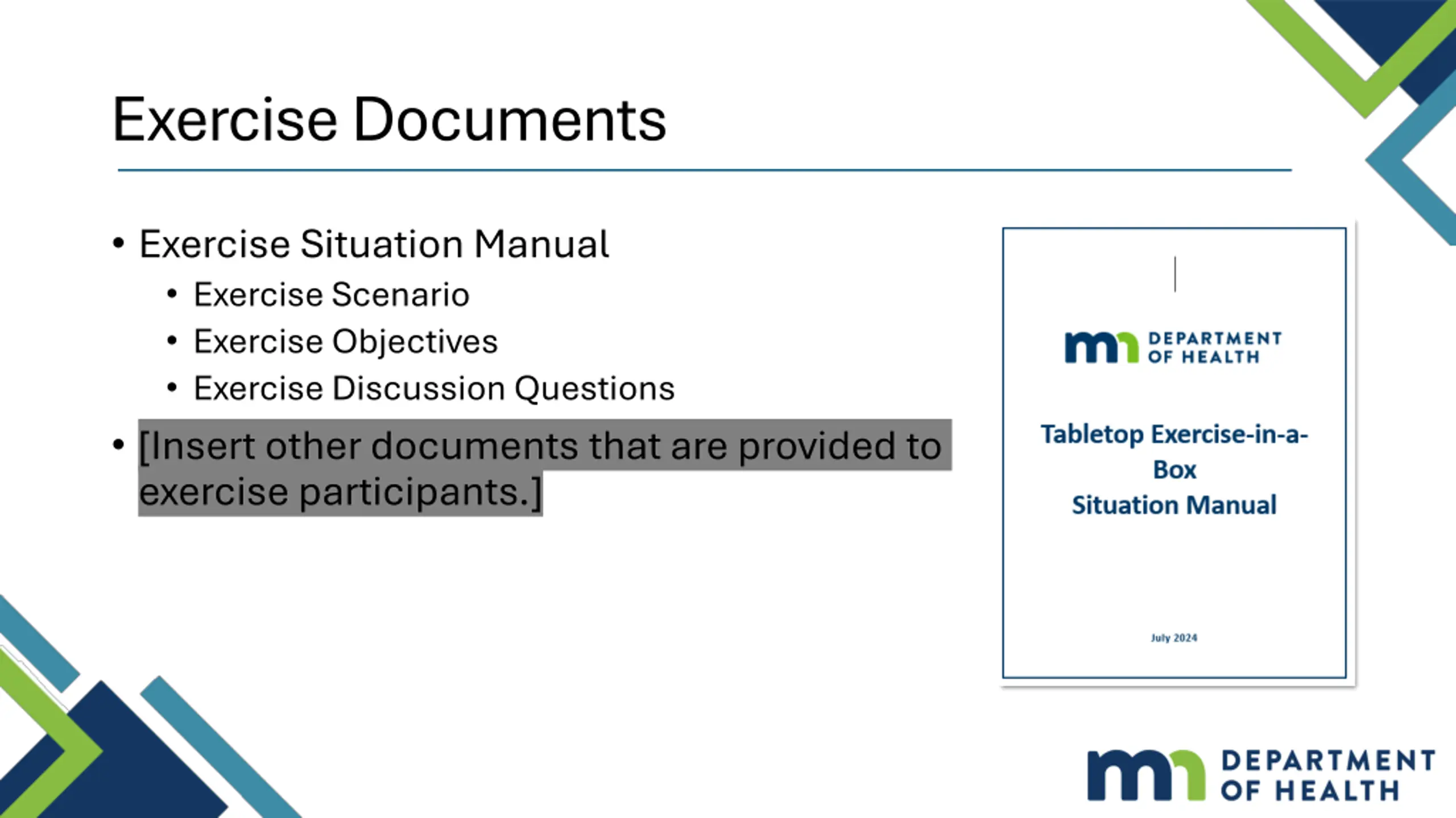 Exercise Documents Exercise Situation Manual Exercise Scenario Exercise Objectives Exercise Discussion Questions [Insert other documents that are provided to exercise participants.]