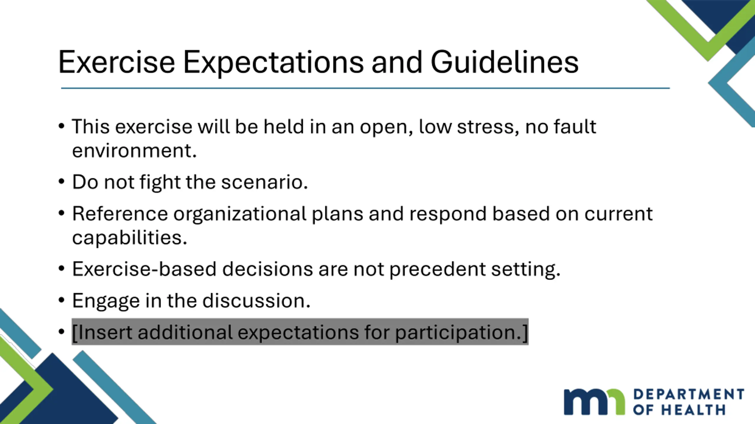 Exercise Expectations and Guidelines This exercise will be held in an open, low stress, no fault environment. Do not fight the scenario. Reference organizational plans and respond based on current capabilities. Exercise-based decisions are not precedent setting. Engage in the discussion. [Insert additional expectations for participation.]