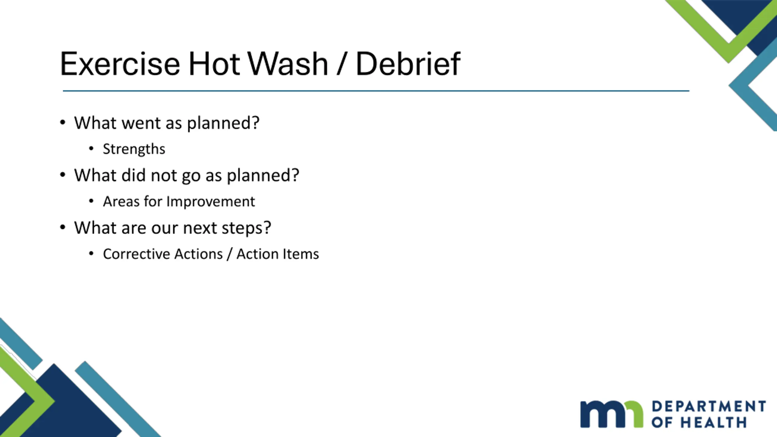Exercise Hot Wash / Debrief What went as planned? Strengths What did not go as planned? Areas for Improvement What are our next steps? Corrective Actions / Action Items