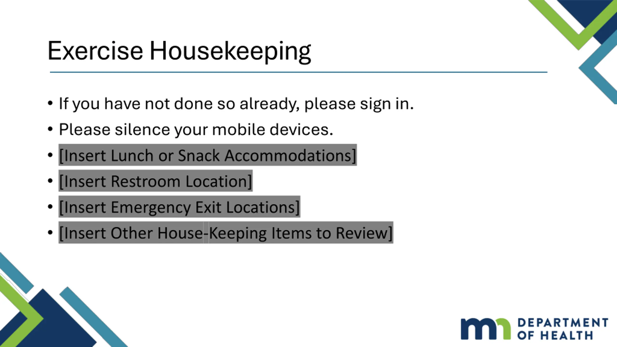 Exercise Housekeeping If you have not done so already, please sign in. Please silence your mobile devices. [Insert Lunch or Snack Accommodations] [Insert Restroom Location] [Insert Emergency Exit Locations] [Insert Other House-Keeping Items to Review]