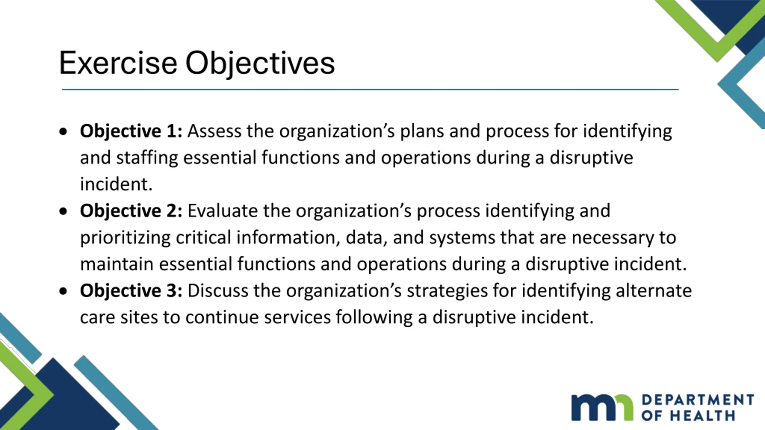 Exercise Objectives Objective 1: Assess the organization s plans and process for identifying and staffing essential functions and operations during a disruptive incident. Objective 2: Evaluate the organization s process identifying and prioritizing critical information, data, and systems that are necessary to maintain essential functions and operations during a disruptive incident. Objective 3: Discuss the organization s strategies for identifying alternate care sites to continue services following a disruptive incident.